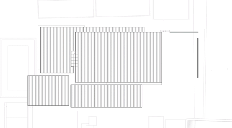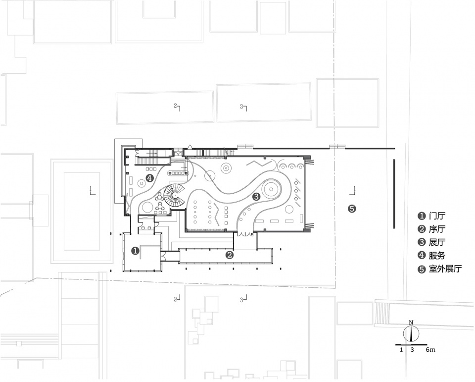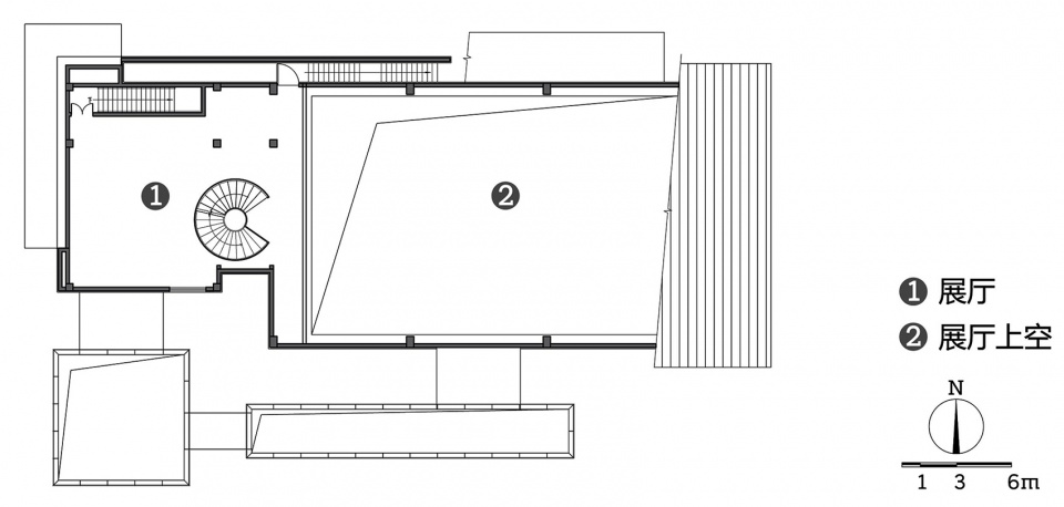 屋面由中心向四周延伸,解构的屋顶分别对应不同的功能分区:门厅、序厅、展厅和服务,构成不对称的风车状微型聚落,在古典建筑对称性构图的基础上增加现代建筑非对称的均衡感与动态性特征。建筑北侧做双层屋檐处理,分别呼应北侧老供销社商店木构建筑的两层屋檐,与遗存的老建筑取得体量尺度上的协调。