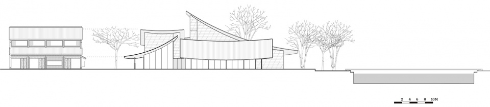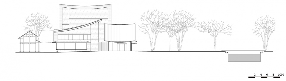 As a continuation of the “moat” idea, the project retained the surrounding water system and placed new bridges on the south and east of the art center to connect the site with spaces across the water. By respecting the scale of the existing wooden architecture and designing a sandbank landscape composed by green plants and water features, the new art center continues the traditional spatial layout, creating a dialog between itself and the local culture.