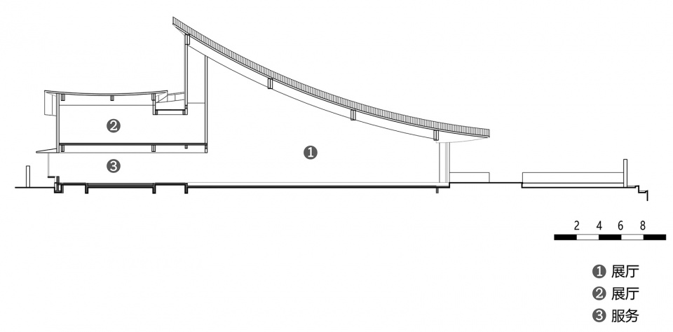屋面最高点达15m,建筑师尝试以新的建筑语言回应历史,将传统的屋顶形式解构为四片单坡双曲屋面。低矮的檐口回应老街既存建筑尺度,屋顶向中心汇聚,为展览功能创造空间。化整为零的策略既巧妙地化解了大体量展馆与小体量历史保护建筑的矛盾,又形成了具有当代精神的标志性文化形象。