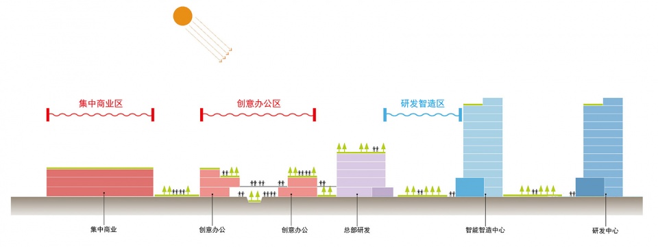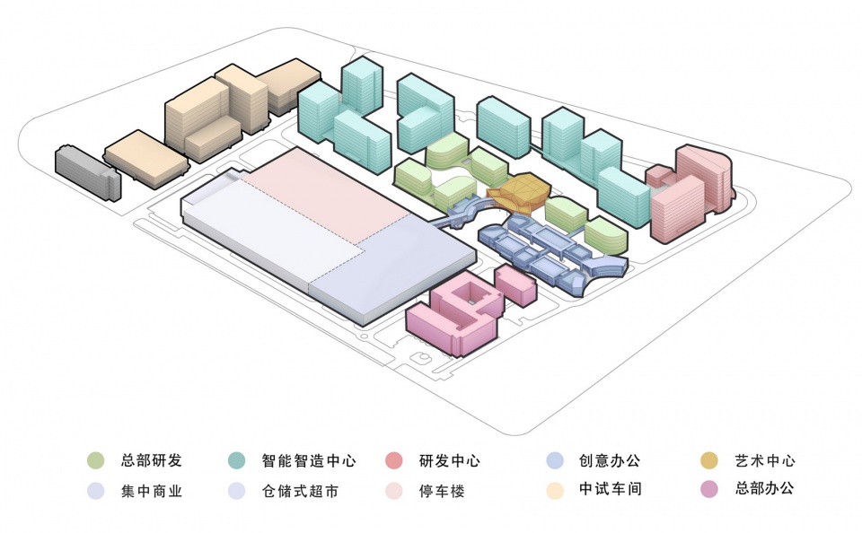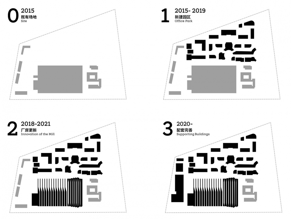 基于这样的反思,建筑师提出整体规划的目标:“不局限于提供一个产业的容器,而是融合多种功能为一体,塑造一个综合的社区。”功能的丰富、尺度的合宜、密度的适中是着眼点。整片21.5公顷的土地分三期启动建设,具有极为丰富的功能业态。旧厂房北侧用地为一期,容纳智能制造中心、研发中心、创意办公、艺术中心等;旧厂房的更新为二期,通过功能再生容纳仓储式超市、集中式商业、停车楼;旧厂房西侧为三期,建设复合时代所需要的中试车间等。