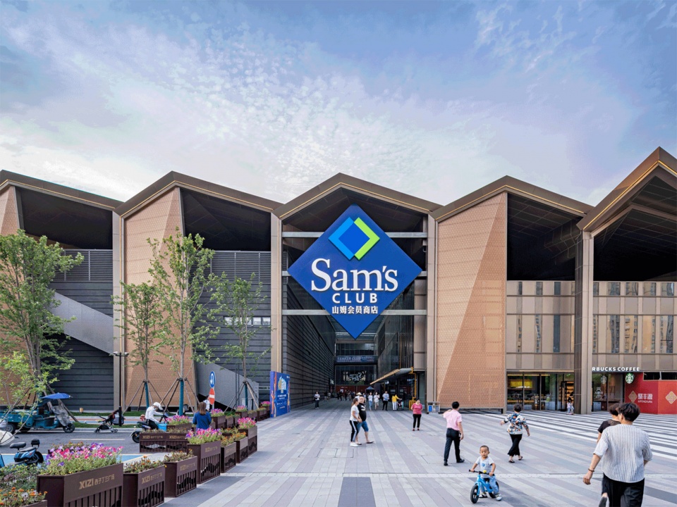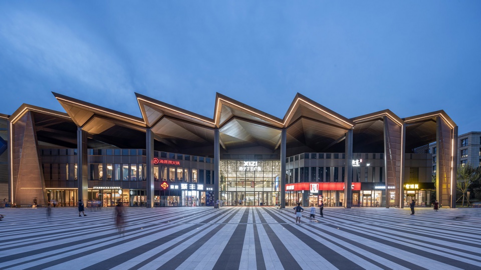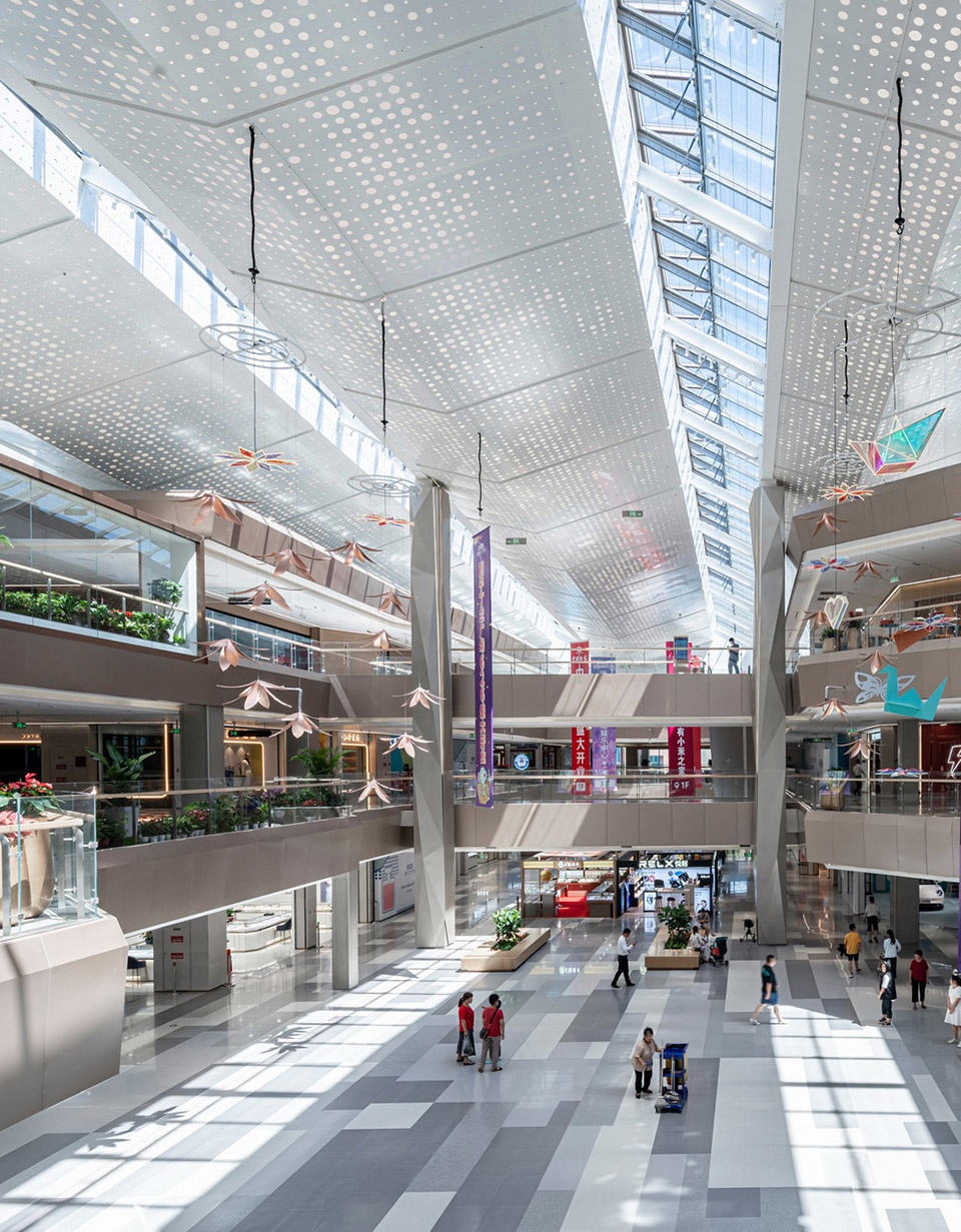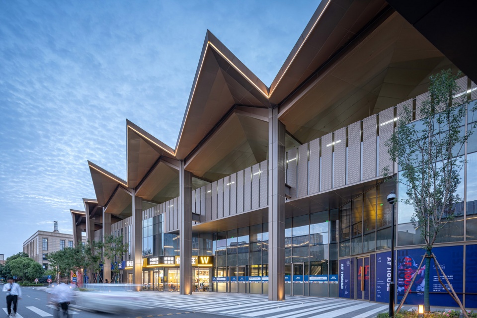 The design scheme retains the existing steel structure and column span, focusing on functional replacement and skin reconstruction. The built-in functions include a Sam’s Club of approximately 20,000 square meters, a centralized commercial area of 30,000 square meters, and a parking building of 27,000 square meters. The original color steel plate roof was updated to a reddish-brown metal roof. A zigzag skylight system with a 12-meter module was established through the “cutting-folding” method. The folded plate shape on the facade forms a virtual and real rhythm to improve the monotonous and lengthy appearance of the existing factory along the street.