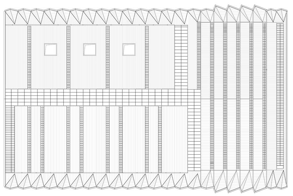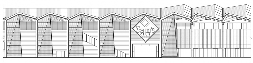 设计方案保留了既有的钢结构及柱跨,重点进行功能置换和表皮重构。置入功能包括约2万㎡的山姆会员店、3万㎡的集中式商业及2.7万㎡的停车楼。原有的彩钢板屋面更新为红褐色金属屋面,通过“裁切-翻折”的手法,建立以12米为模数的锯齿状天窗体系;立面上的折板造型形成虚实韵律,改善既有厂房沿街面单调、冗长的面貌。