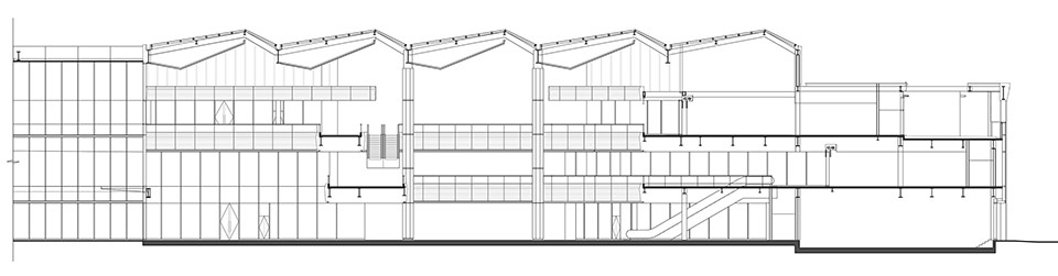 建筑的人行主入口,悬挑的金属折板成为具有标识性的雨棚,与方盒子商业体量脱开、形成对比。所有的形式语言操作严格遵守旧厂房的长宽高控制线、不突破原有轮廓。集中式商业吸取了航站楼的商业布置方法,以一片完整的大屋顶覆盖下部高低错落的商业盒子,现代商业氛围与工业建筑的空间特色得以交融。