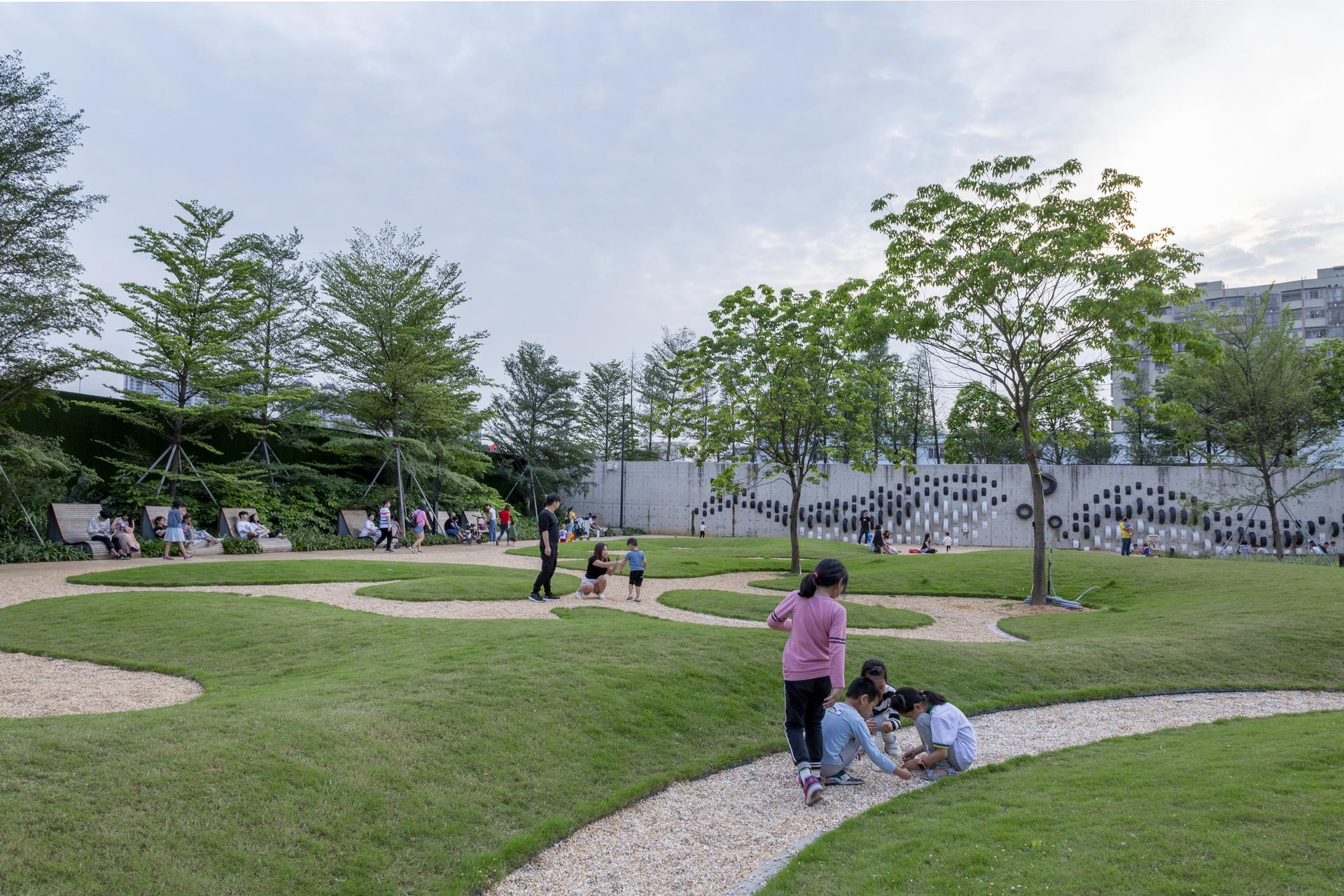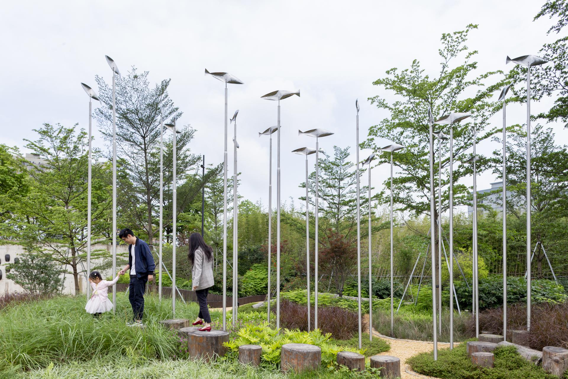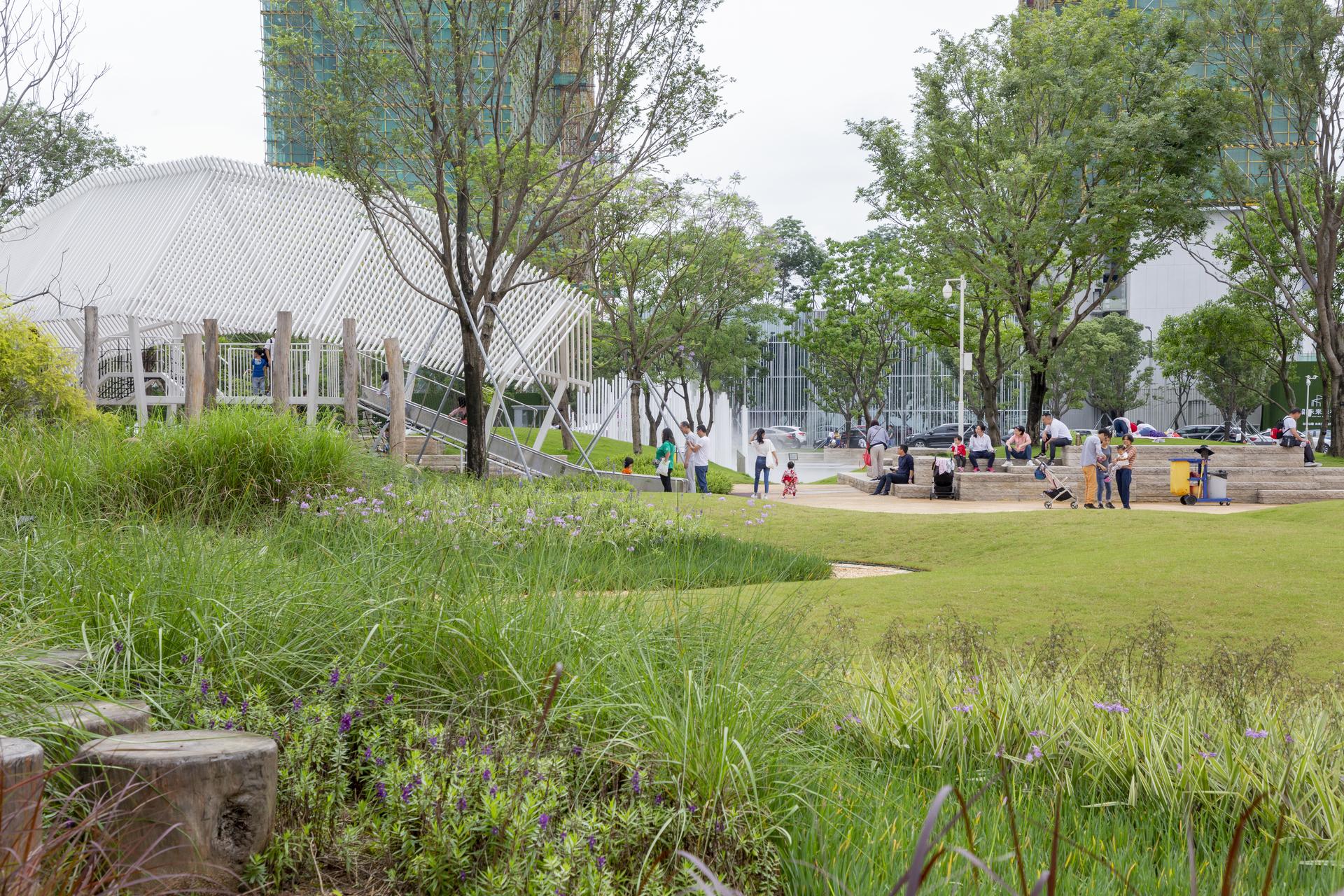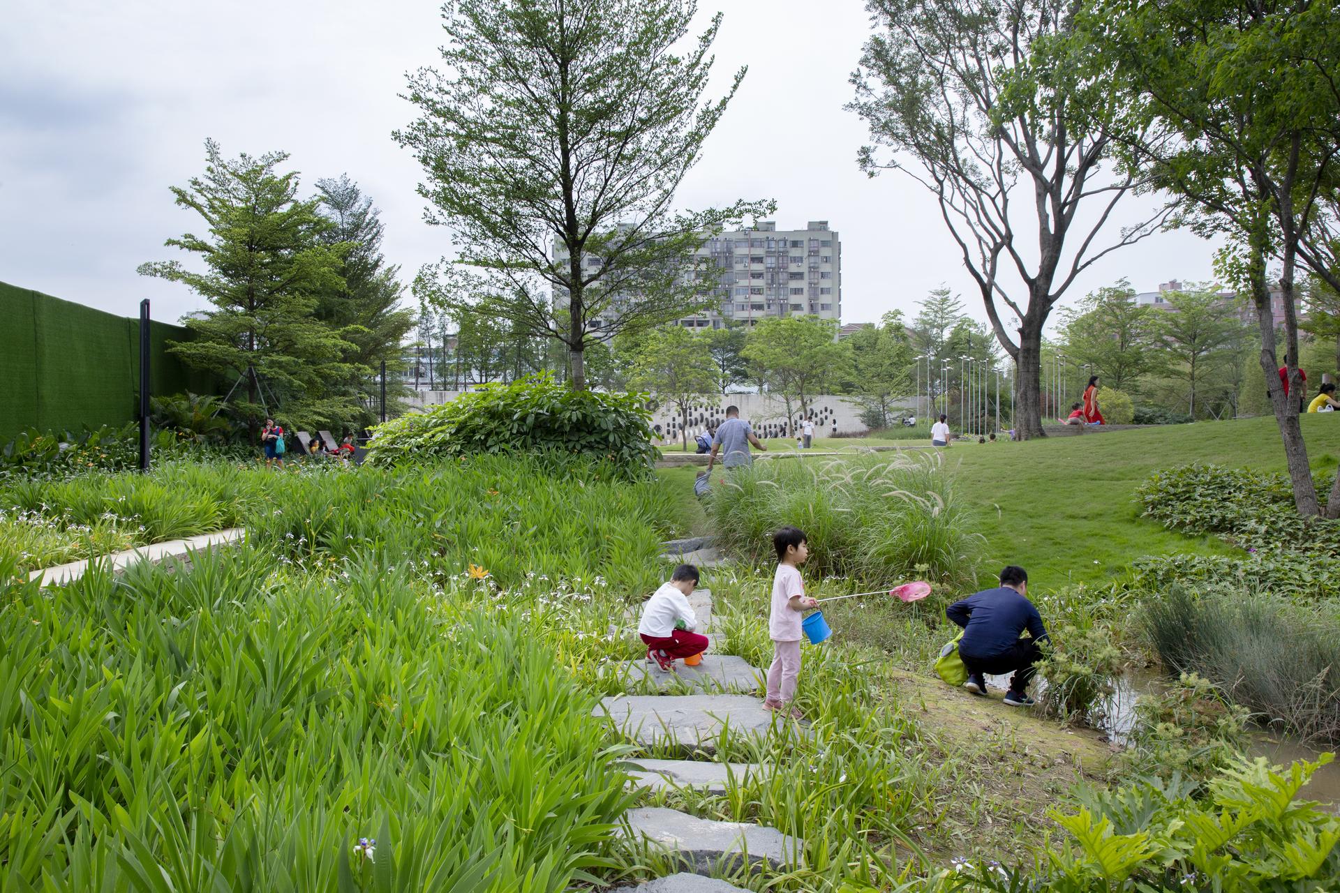 配合建筑的“林”,我们把景观定位到“水”;林是鸟的天堂,水是鱼的家园。场地内雨洪管理及水生态系统是我们每个设计的基本功能之一;生态环境多样性营造在广州地区相对容易,丰富的下木植物可选择性使场地很快形成自己的微气候;环境教育结合各类人群日常使用需求,既是生态系统在人的行为上的对应,也是一条潜在的氛围营造规则。