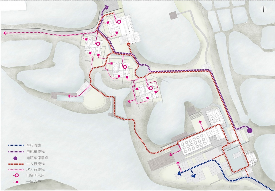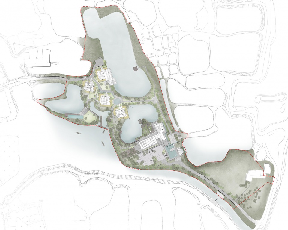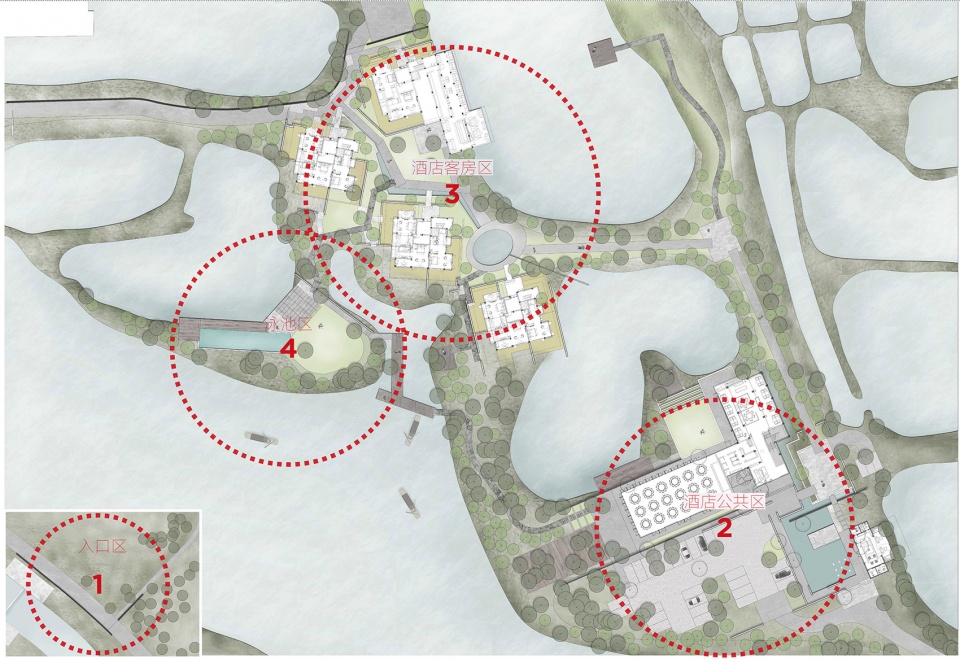 水路流线基于湿地的原始地貌而设计,使习惯了陆上出行的现代人群得以沿古水道前往酒店,在摇橹船徐徐的桨波中,获得观察西溪湿地的另一种视角。