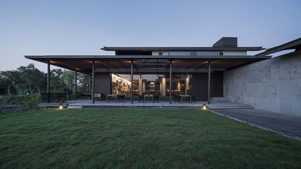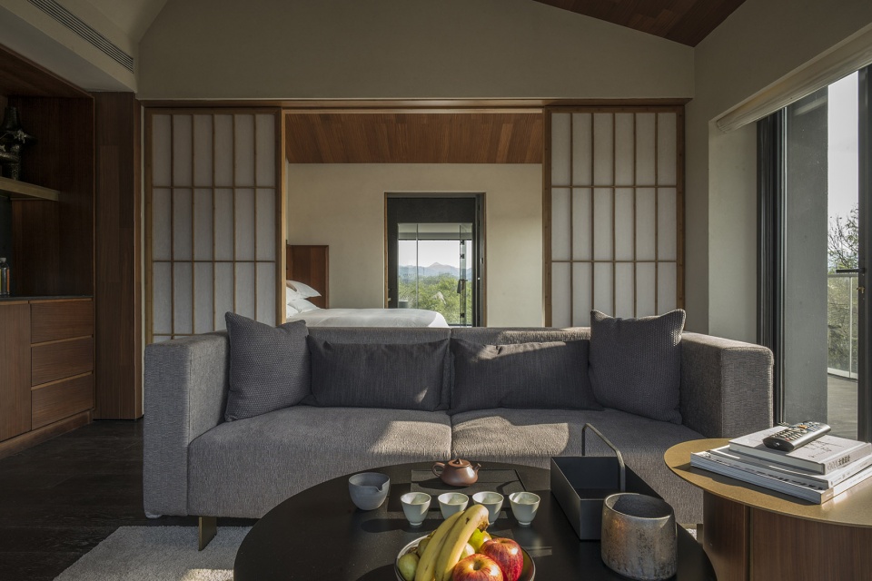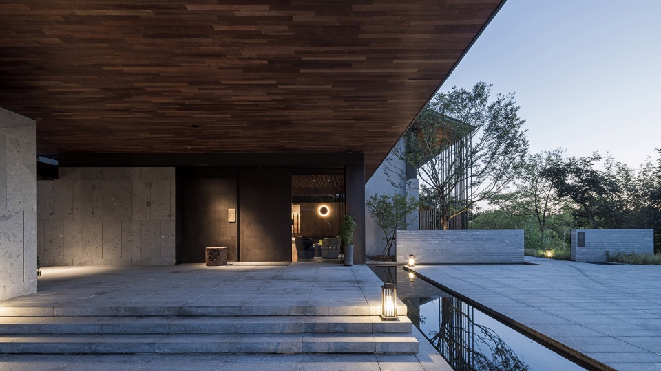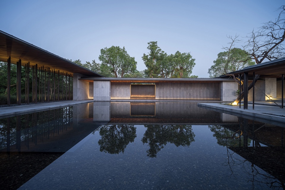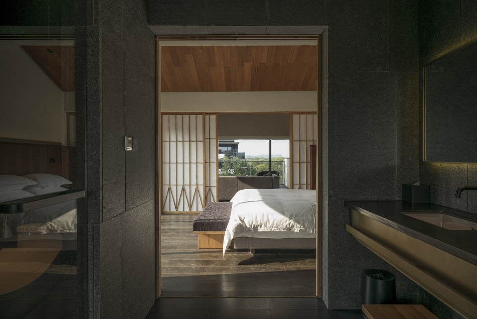 酒店功能布局因地制宜,入口一爿琴台与柿树静立于水院中央,以水平线条连接东侧视野开阔的“野堂”与西侧的回廊。