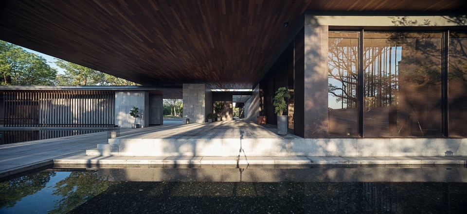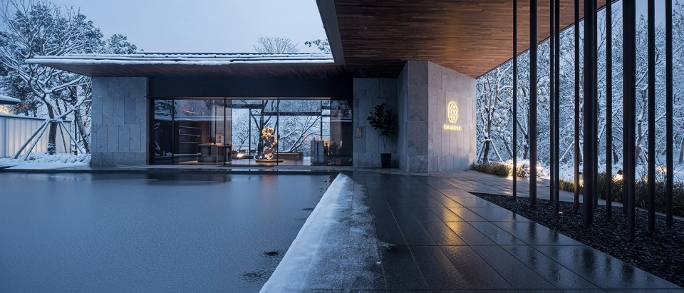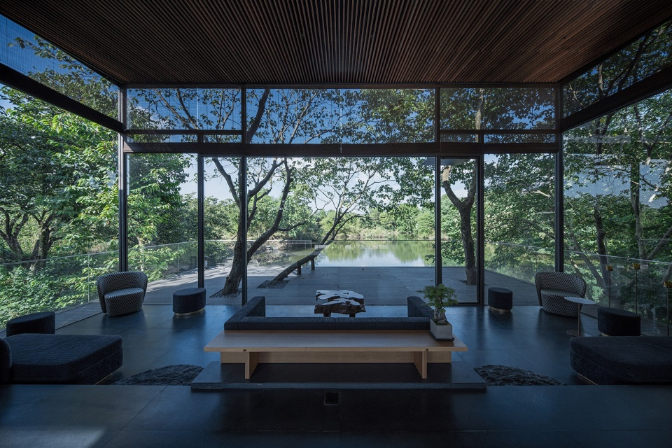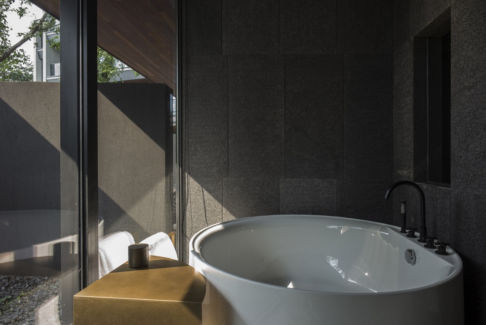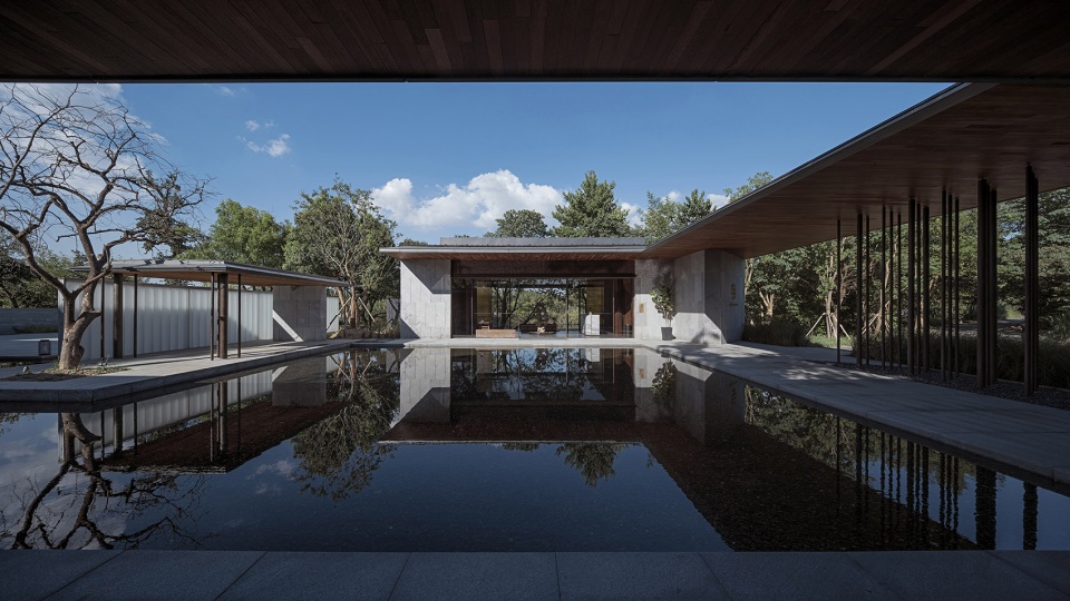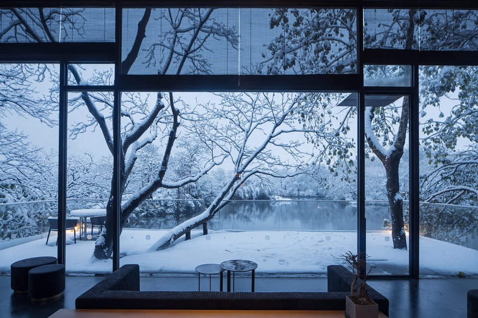 The functional layout of the hotel is adapted to local conditions. In the entrance, a table of Chinese zither and some persimmon trees are right in the middle of a water court, horizontally connecting the “wild hall” with wide view on the east side and the corridor on the west side.
