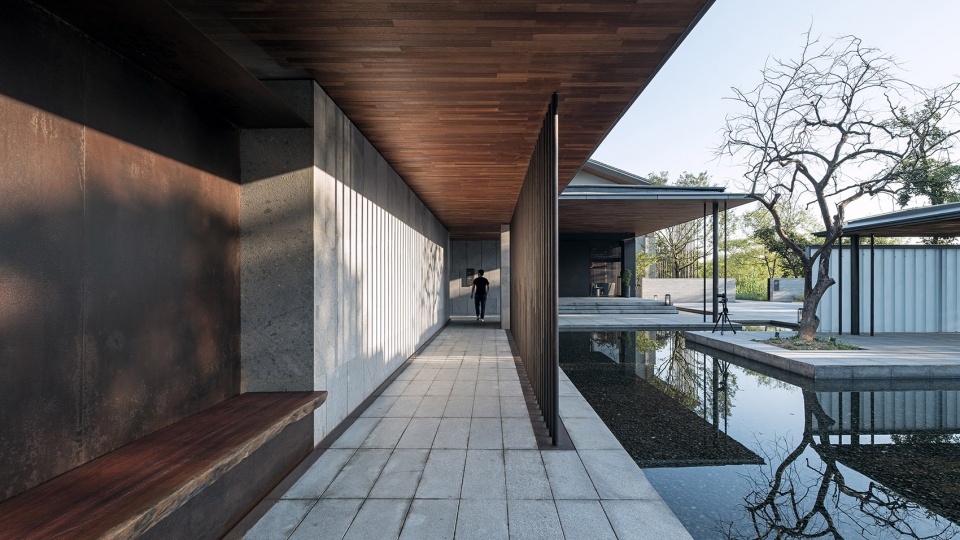 回廊以二度回收的老木板、锈化钢及水冲面大理石作为主材,设计师借此将“时间”的概念引入空间——当材料的原始色泽和触感在风霜雪雨中缓慢演变,时间的流逝也便记录在空间的一石一木之中。