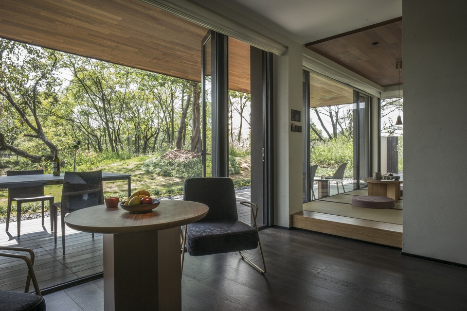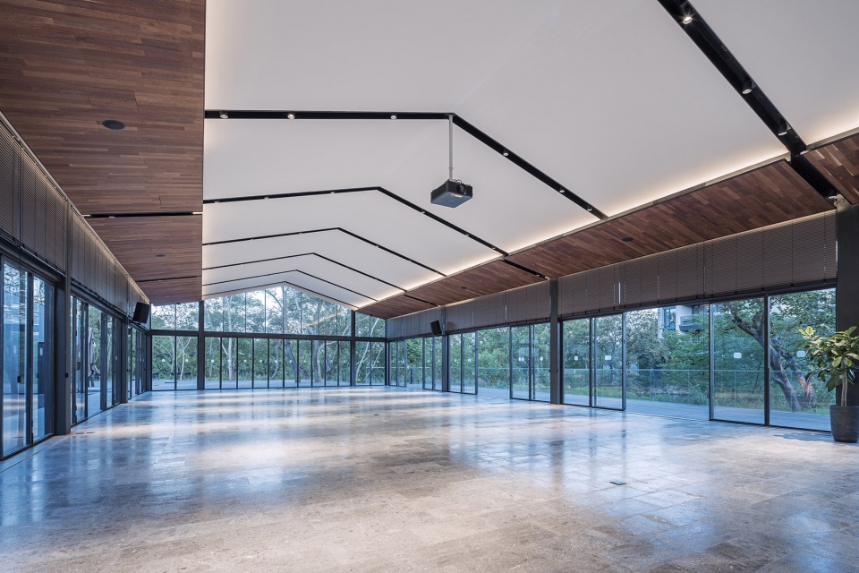 The banquet hall with plentiful lights is surrounded by 270 ° French window, and its indoor space covering an area of 300 ㎡ seamless blend with outdoor natural forests, lawns and waterside terrace. It would be a unique experience to hold a banquet, clothing show, auto show or any other activities in a such a forest-like place.