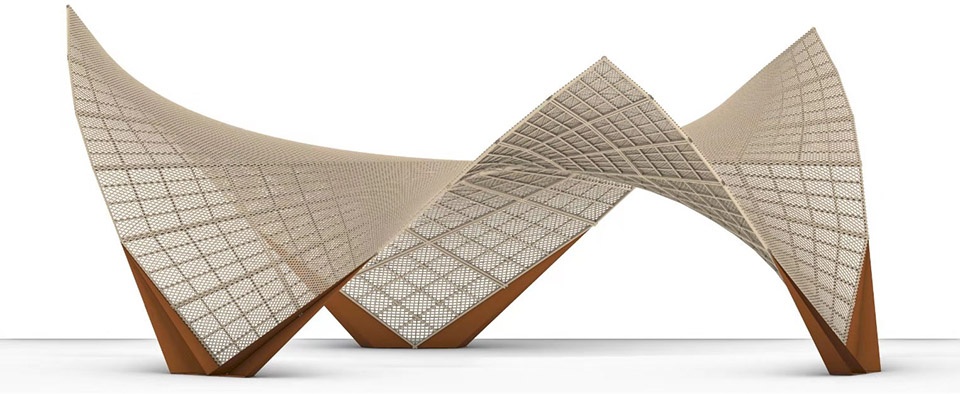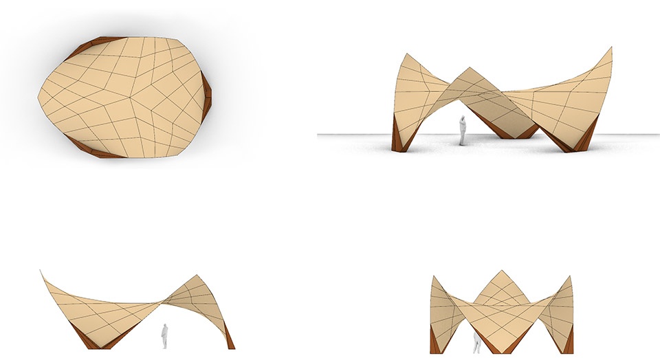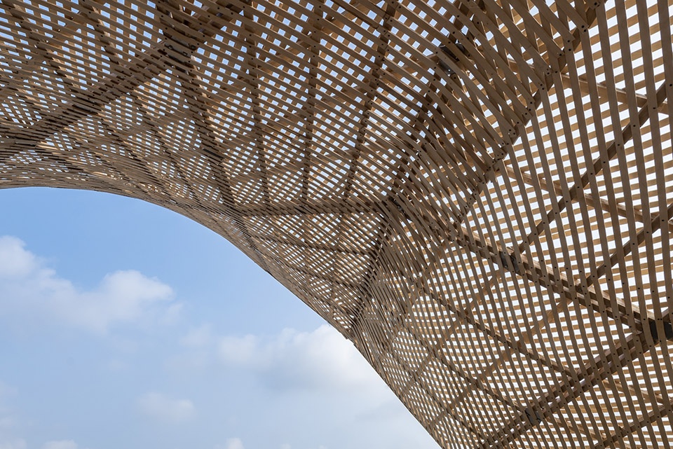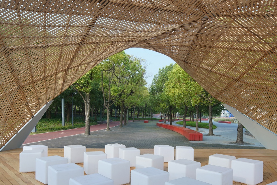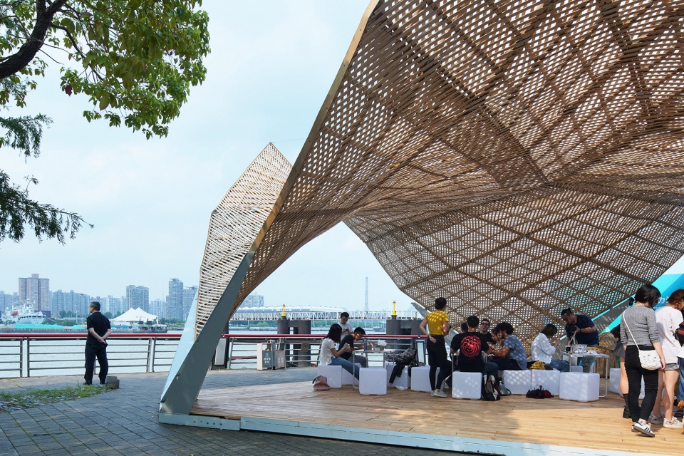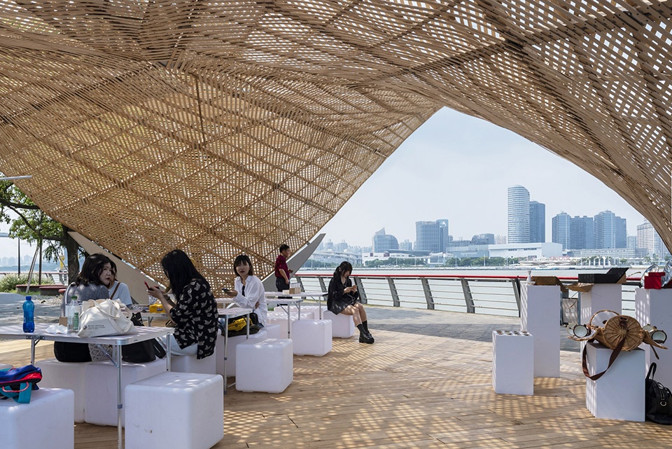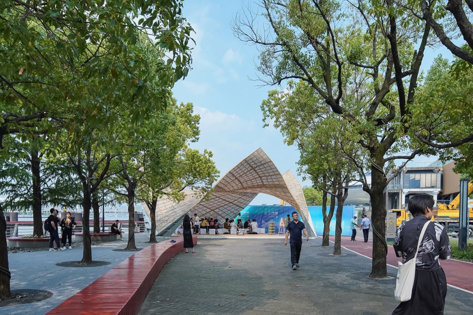 On a steel structure base covering an area of about 100 square meters, the hyperboloid shell looks like a wave dancing, or a tent falling from the sky. It touches the ground with three lightweight supports. Its open and dynamic appearance communicates a sense of openness to the public and echoes with the site characteristics of the riverside walk. The wooden shell extending from the top to the ground is covered with intertwined wooden strips, reminiscent of the intimacy of natural materials. During non-activity periods, the installation is an ideal place for relaxation. The curved cover framework delineates the beautiful scenery on the other side of the river, making the installation a superb place to enjoy the river view.