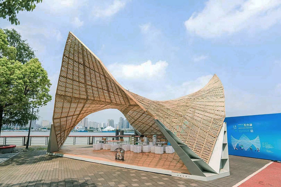 2019年9月,在历时1个月预制、10天现场搭建后,一件名为“引力波”的建筑装置作品在黄浦江边呈现。作品是“引力场”系列活动的第四届,由goa大象设计联合来自苏黎世联邦理工学院的设计团队共同构思概念,goa大象设计深化建造而成。试图以一次真实、完整的空间实验,探索融合艺术性、结构创新性并具备快速建造可能性的临时性公共空间,对“城市微更新”话题提供有效线索。 整件作品被考虑为一个城市公共生活的发生器,在短暂的存在周期内作为世博滨江区域的开放舞台存在,容纳手工艺课堂、先锋展览、即兴戏剧等活动。