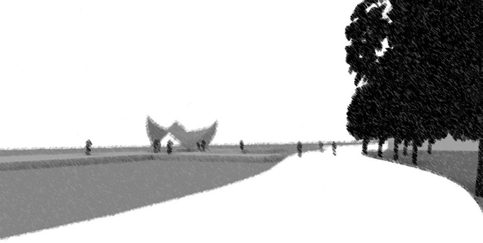 占地约100㎡的钢结构基座上,双曲面壳体如同一片翩然起舞的波浪、或是一顶从天而落的帐篷,以三个轻盈的支点接触地面。开敞、富有动态的形象展示出向公共开放的姿态,回应着滨江步道的场地特征。从顶部延伸至地面的“木壳”被细密的木条交织覆盖,给人以自然材料的亲切感。在非活动时段,装置为来此休闲的人们提供驻足之地,曲面状覆盖框剪出对岸的美景,是一个欣赏江景的绝佳场所。