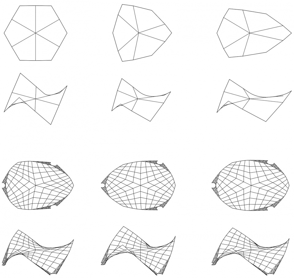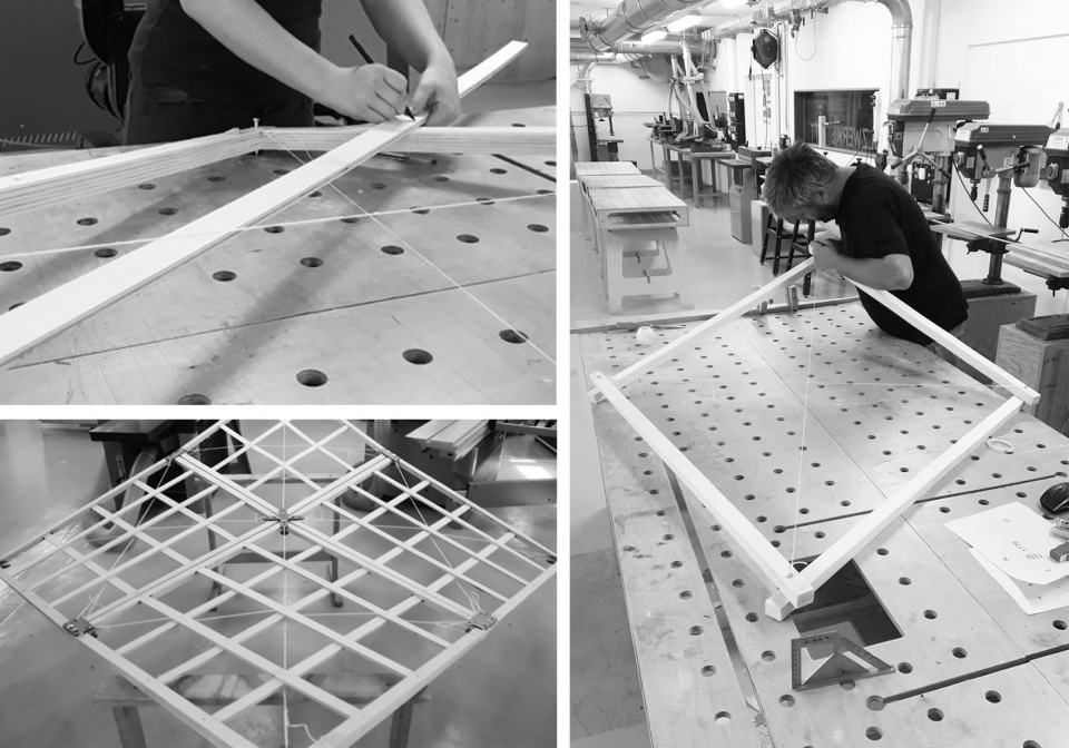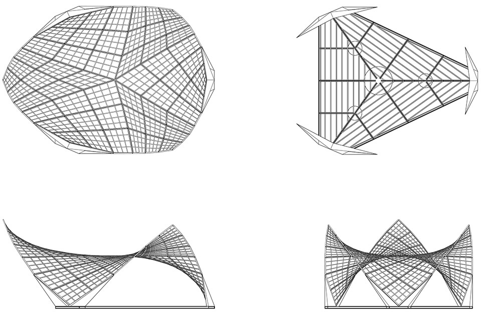 结构思考对于作品的设计过程起到关键作用。得益于双曲面自身形式所独有的结构坚固度,作品的木制双曲薄壳实现了极薄的结构厚度——表面积达140㎡的双曲面仅有6厘米厚。最终的壳体由54个直纹双曲面基本模块构成,模块预制后现场拼装组合成连续的光滑曲面。相比于单曲面,抛物双曲面上下的两组曲线均可承重,更高的承重效率使得“极薄”的表面成为可能,成功实现了平均净高4m的连续顶盖。预制拼装的做法使得现场建造被控制在10天以内,实现了“快速建造”的灵活性。