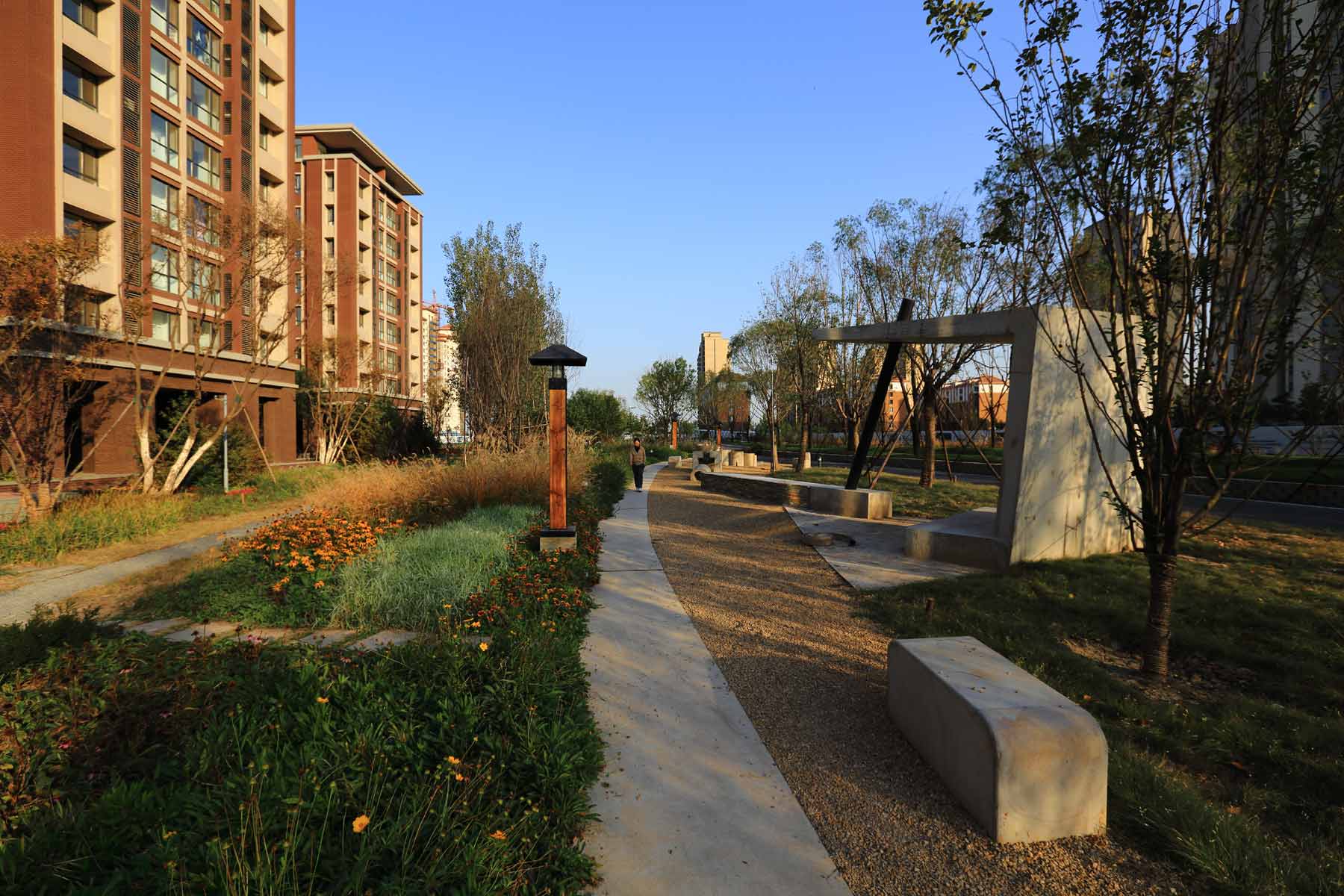 天津万科东丽湖五期中心-住宅景观占地约1.5万㎡,以现代极简主义设计手法,提供轴线阳光草坪、景观廊架休息区、儿童活动区、架空层宅间活动空间等,以243元/㎡的超低成本实现了一个功能全面,美观舒适的社区景观环境。