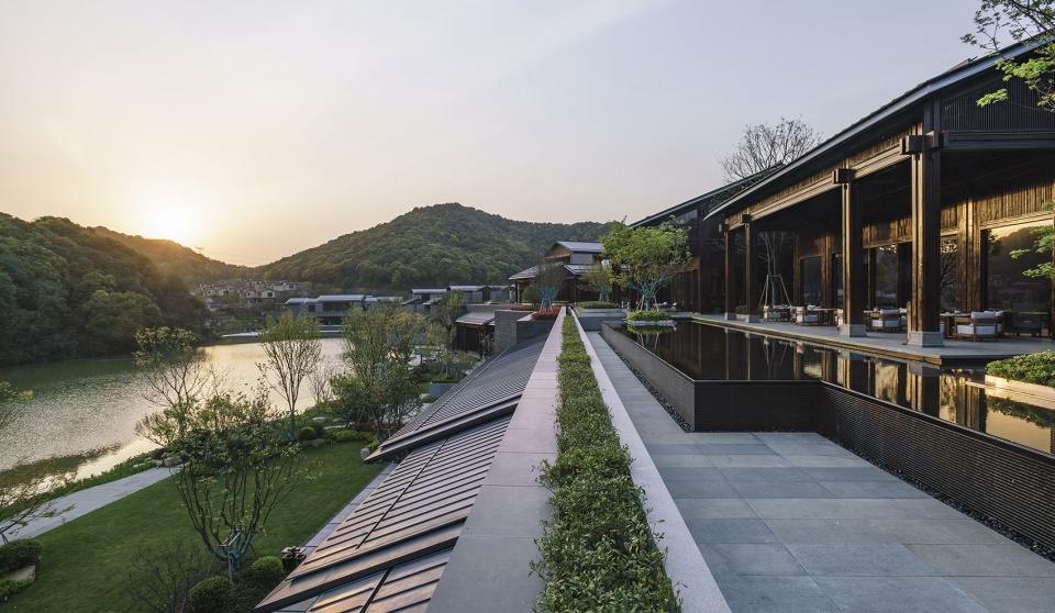 餐饮区外长达150m的折线形水台构成一个令人印象深刻的山居度假场景。曲折的水面、错落的屋宇、高差丰富的台基创造出动人的空间序列。人在这个序列中漫游驻足,体会到山与湖的千般景象。山、水、人、建筑组合为一个紧密的系统,铺陈出人与自然之间一段亲密的“伴随”关系。