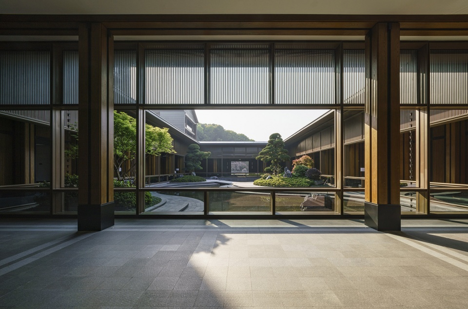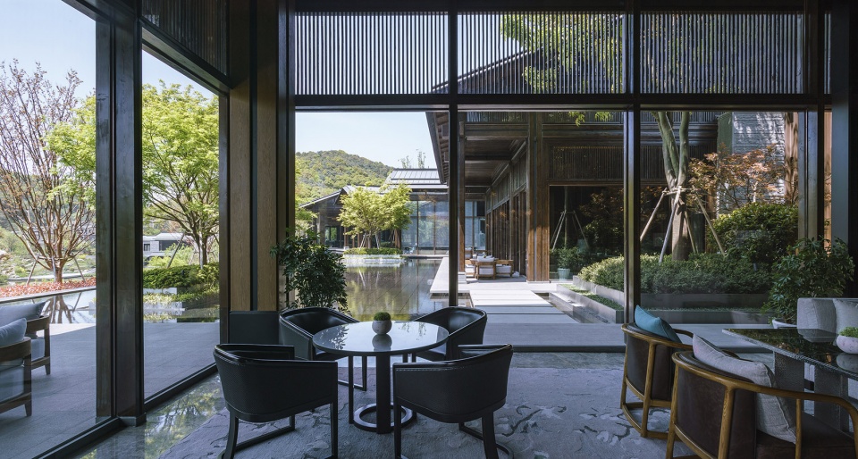 庭院、檐廊、落地玻璃窗的设置强化了空间的透明性,实现了外部山水景观与室内空间的融合。景观不仅可视,而且真正参与到人们俯仰坐卧的各种活动之中。大量木材的使用与外部景观呼应,进一步强化出温馨、自在的氛围。