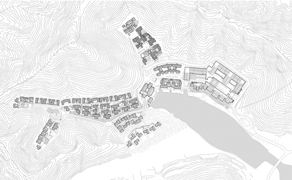 浙江地区“七山二水一分田”的地域特征很快成为一个联想对象。通过对楠溪江古村、丽江宝山石头城等山地村落样本的系统研究,建筑师对11.3万平方米场地进行了从地形、台基到建筑的整体规划。最终,在化整为零的设计策略下,酒店呈现为一个由诸多小体量构成的山地村落。整个项目沿山势建立起完整而有机的标高系统,以山溪为东西向脉络、山坡为南北向脉络,形成细腻、丰富的山地群落体验。