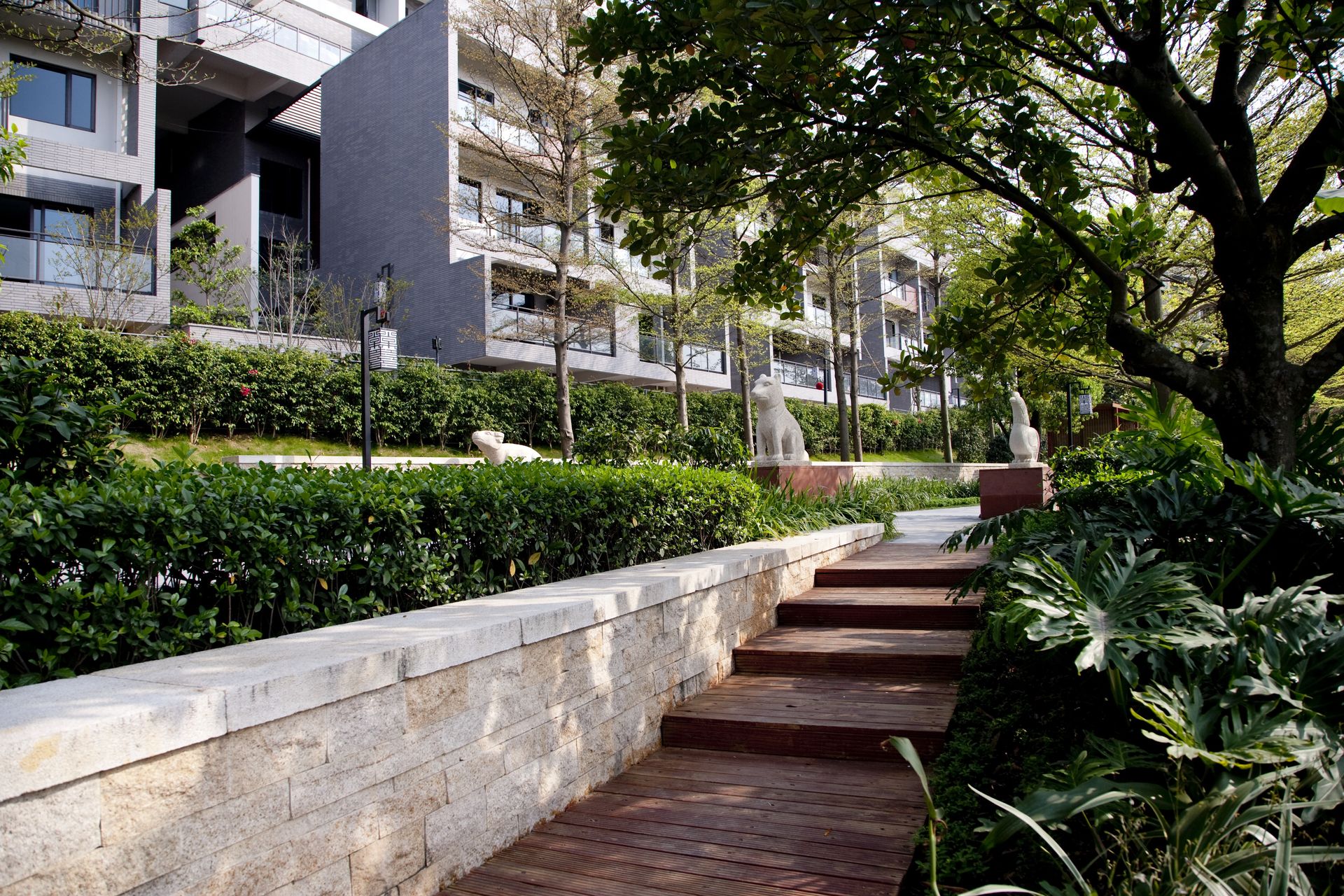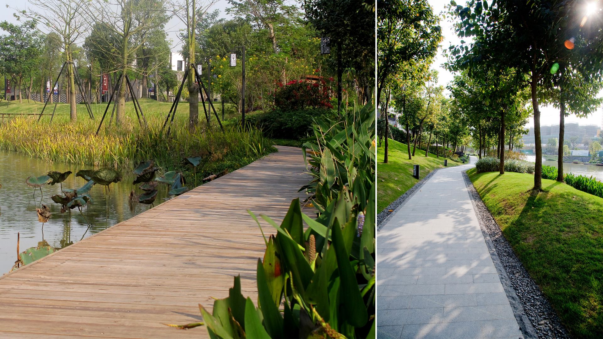 万科棠樾度假别墅区的内湖景观设计以周围良好的自然资源为依托。以会所为中心的社区中心公共景观强调景观的协调性和多样性,沿湖一圈步栈道在不同地段设计不同的景观类型,给游者以丰富的景观体验。