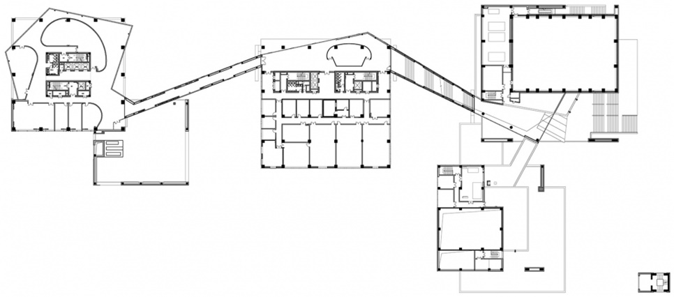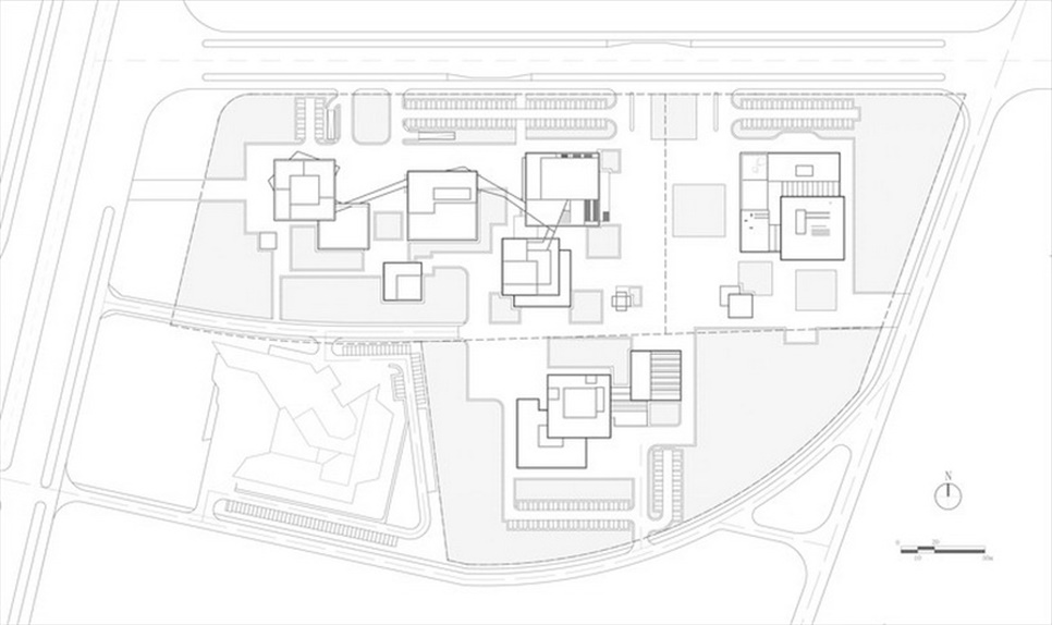 The total construction area of the whole project is less than 60000 square meters, and the construction land is about 90000 square meters, which is relatively loose. Functions include radio, television and radio and television agencies, network companies, Changji daily, the state Federation of literary and art circles, Hui literature society, Quzi Opera Troupe, song and dance troupe, and library. Therefore, the design scheme breaks up the building volume, divides it into parts, integrates various functions by classification, and integrates the general office area, radio and television station technical office area, studio area and staff restaurant of the library, the two regiments and the media building into multiple cubes of different volumes, which are scattered in the site according to their functional relationship, forming a "media settlement".
