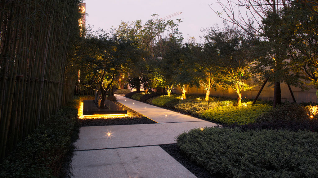 杭州·富力十号示范区,块位于位于杭州市以西,临近西溪湿地。离杭州市中心直线距离约13km。场地周边多为工地,环境较不理想。为营造静谧舒适的空间环境,方案通过高低错落的墙体进行围合的同时,兼顾沿街立面的整体形象。"T"型的景观空间划分为四个部分,严谨的入口以一道七米宽的水幕将行人视线揽入内庭。转身走入舒适的林下幽径、掠过石台,豁然开朗于一片开阔的镜水面,穿过建筑门廊后停留在一处林荫庭院,构成了步移景异的空间视觉享受。