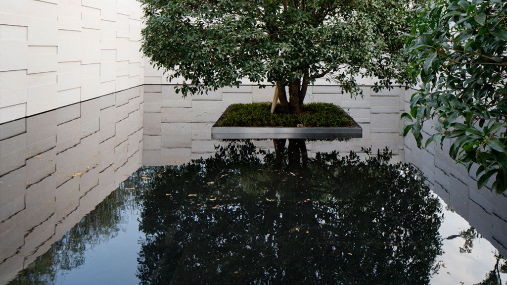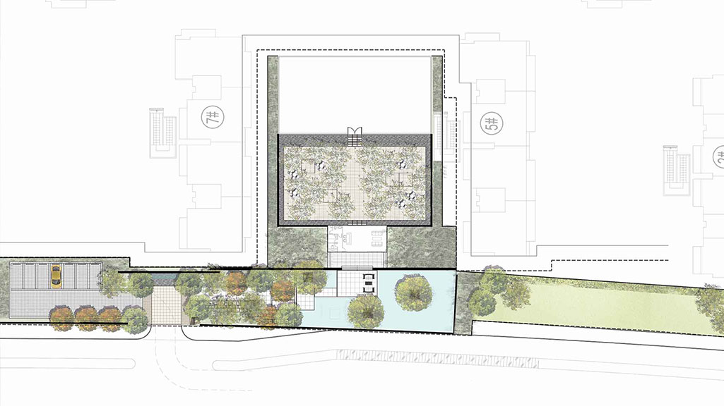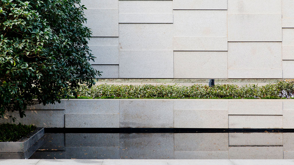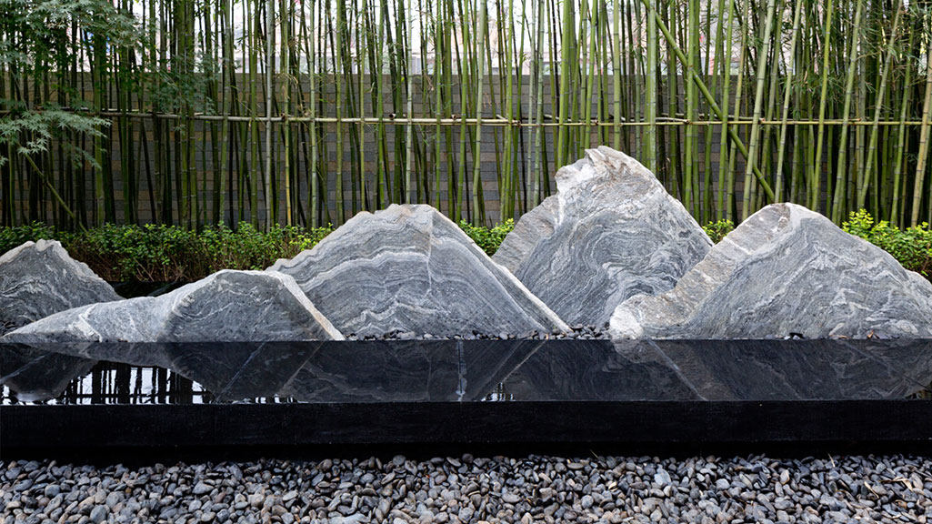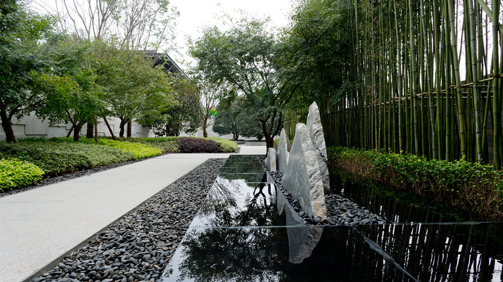 Hangzhou Fuli No. 10 sales center is located to the west of Hangzhou city and close to Xixi wetland. The surrounding environment of the site is not friendly because of many construction sites. To create a comfortable space, we utilize free-standing walls with different heights to define the place as well as introducing a unique facade to the nearby street. The landscape is composed of 4 parts: The entry with a 1.7m wide water screen; A quiet forest path with a beautiful stone sculpture; A mirror pool and a courtyard under tree canopies.