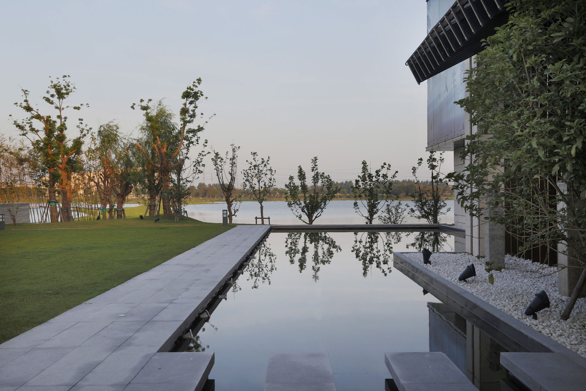 该会所位于玉湖岸边,在初期会作为玉湖居住区的销售中心使用。客户的体验是景观设计的主要考虑因素。主要景观节点包括入口标识景墙,活动草坪,内院水景,湖滨无边水池,休闲观景平台以及小码头。