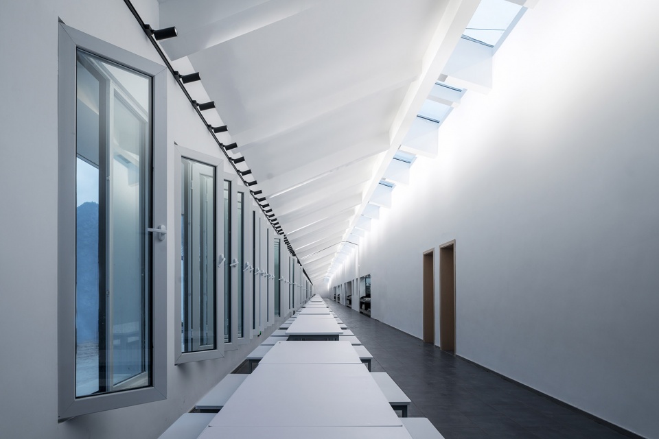 There is a small square in front of the "100m canteen". When entering or leaving, children can sit and stand for a while, communicate or play. The terrain of the square moves according to the mountain. The winding footpaths lead people from the town to the corridor under the eaves, and from the corridor to the corner of the town. Looking back at the canteen from the path in the distance, the slender white wall, the five round arched doors and colored windows also bring a vivid charm to the town. It is integrated with the town.