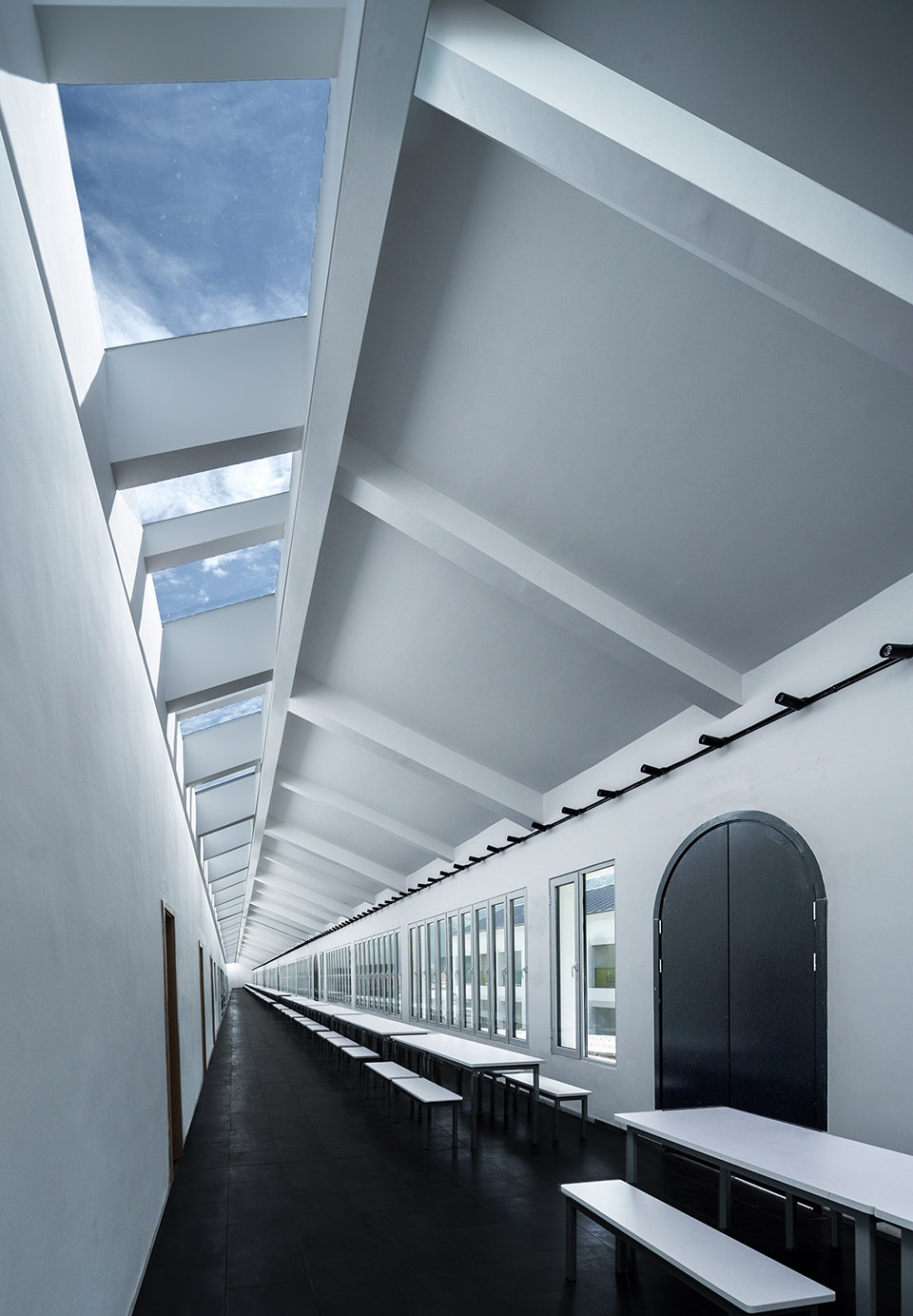 「百米食堂」前侧有个小广场,进入或离开时,孩子们还可以坐立片刻,交流或玩耍。广场地形依山势而动,蜿蜒的步道将人从小镇引向屋檐下的长廊,又从长廊散向小镇的角落。从远处小道回望食堂,细长的白墙上,那五个圆拱形大门和彩色窗户,也给小镇带来一脉灵动的气韵。它和小镇融为一体。