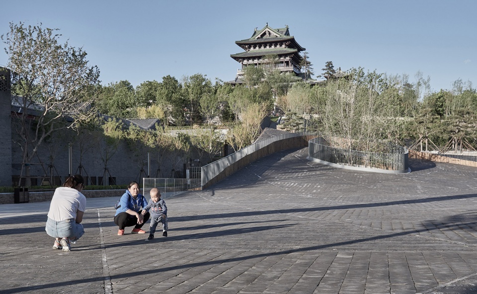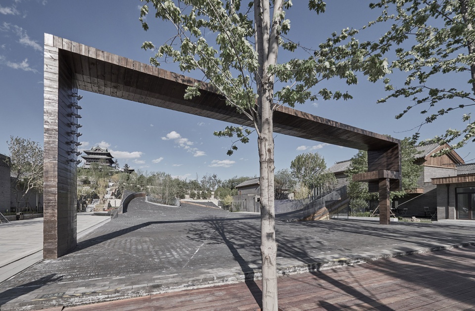 广场的南界有一个大门框装置限定,既是对史传在二十世纪初期前存在于此的戏台的致敬,也是对北侧天田山和永宁阁的框景。