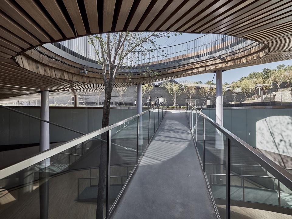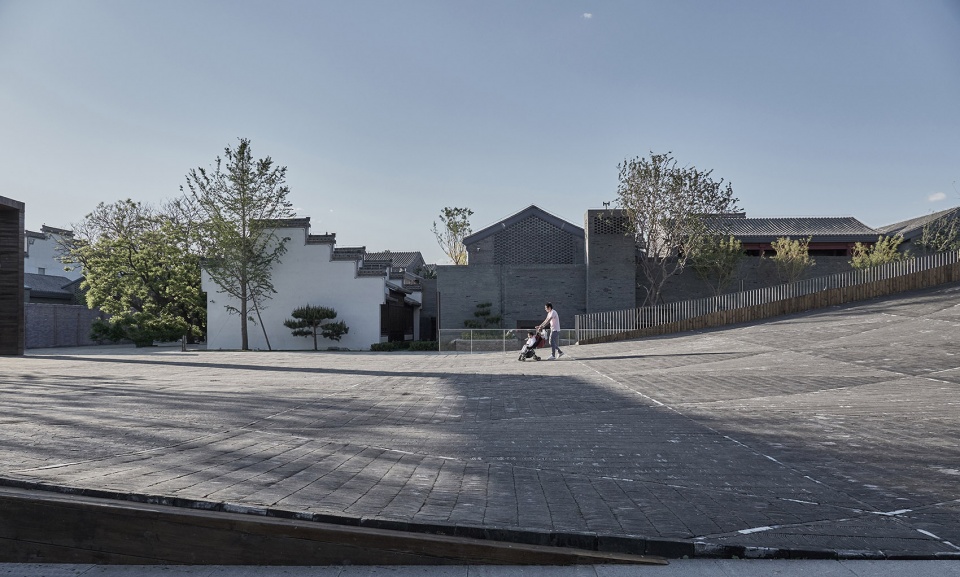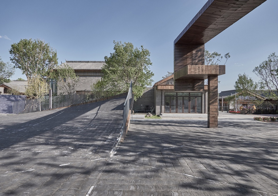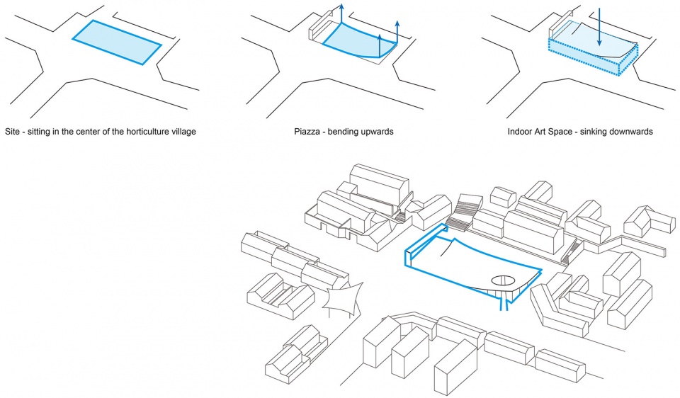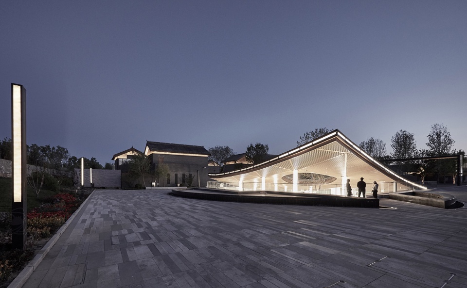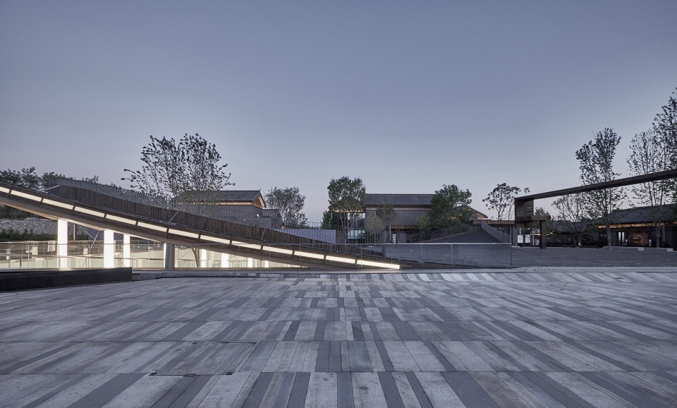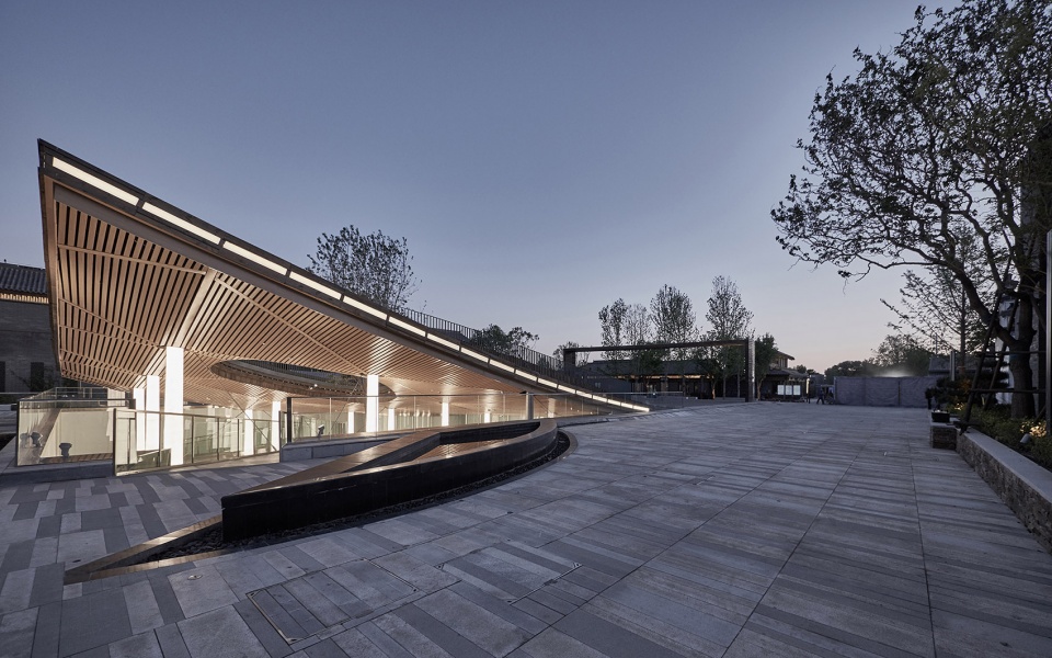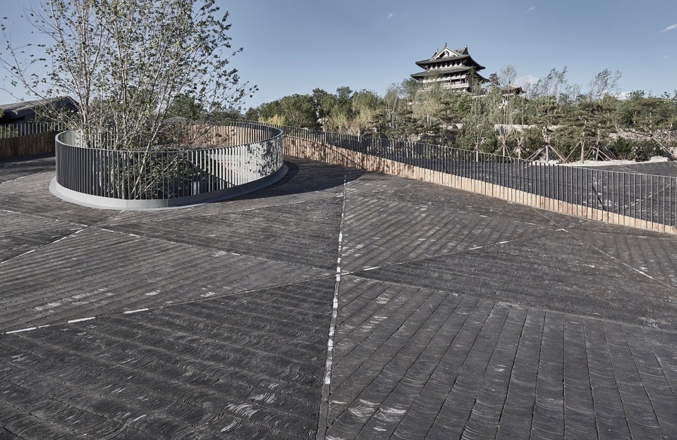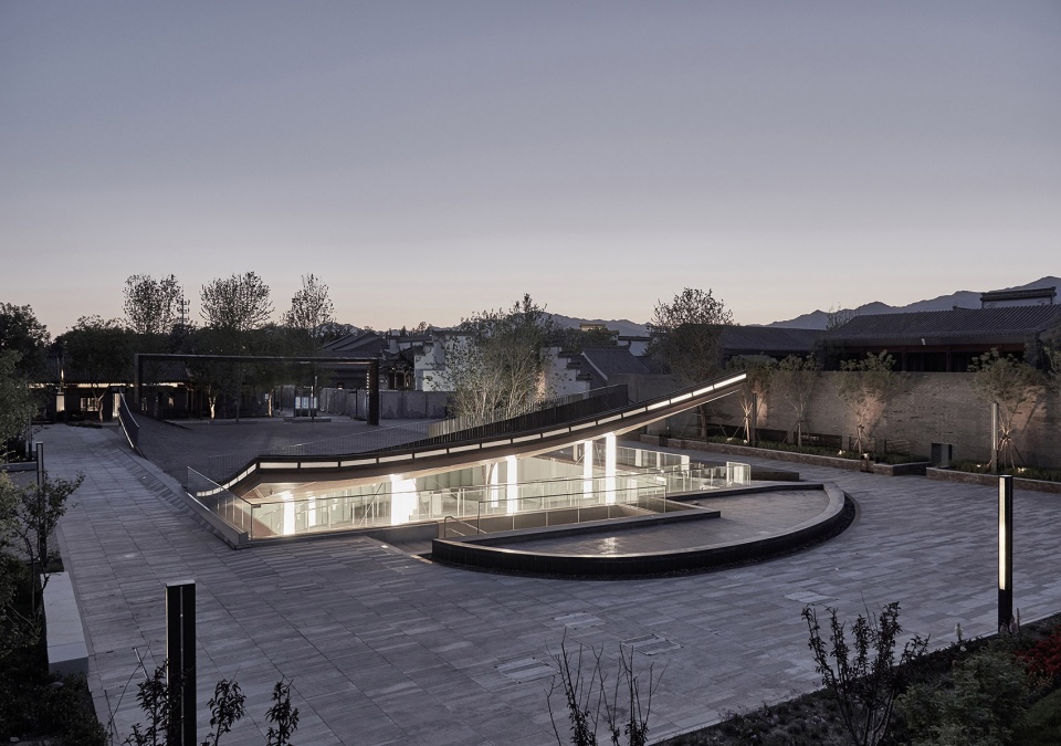 Sitting in the center of the Gujiaying horticulture village, the building features a piazza made of traditional tiles bending upwards, revealing the subterranean art space below.
