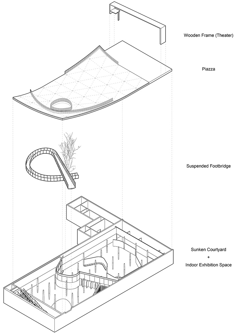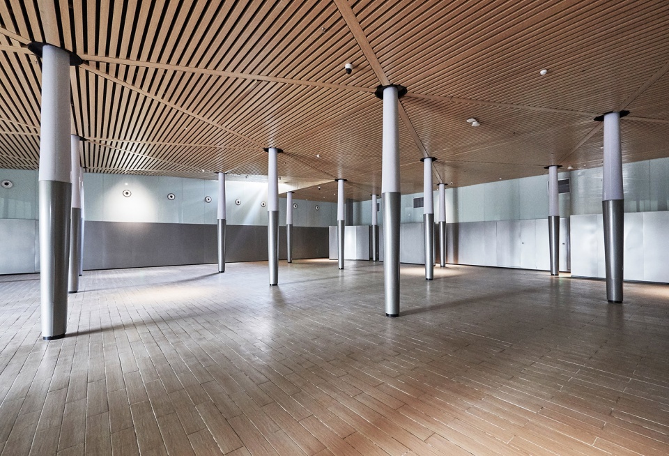 A suspended footbridge winds its way down beneath the raised north-west corner of the piazza, leading to the semi-open sunken courtyard, before entering the indoor exhibition space. The subterranean space features an array of special columns that have cooperated lighting in the upper part, and decorated with stainless steel on the lower part, each column is tapered towards both ends.