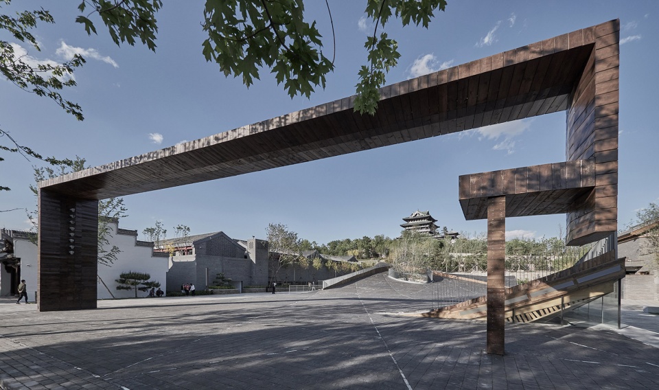 ▼广场南界的大门框装置,是对北侧天田山和永宁阁的框景,the frame at the southern end of the piazza, windowing the Yongning Pavilion and the Tiantian Hill to the north