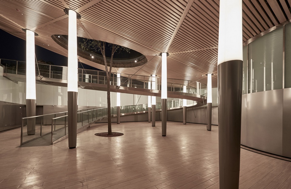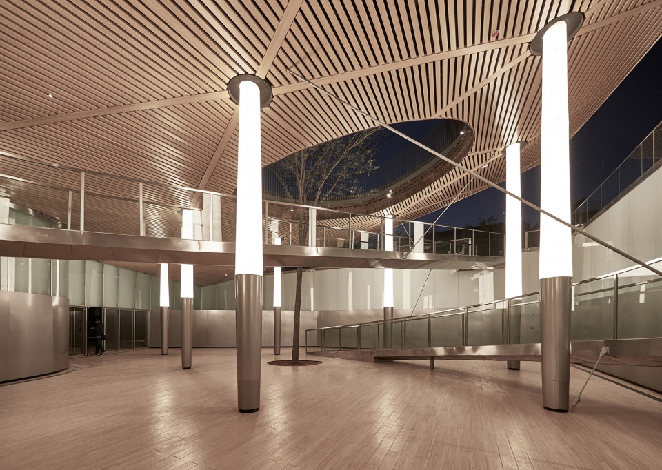 一条悬挂的步桥从广场卷起的西北角蜿蜒而下,引向地下的半室外院落和室内展览空间。在整个地下空间使用了一种特殊设计的柱子,每棵柱子从中间向上下两头收分,上半部分面材为亚克力,内部集成照明,下半部分面材为铝。