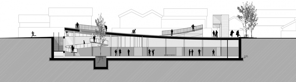 ▼悬挂的步桥从广场卷起的西北角蜿蜒而下,引向地下的半室外院落和室内展览空间,a suspended footbridge winds its way down beneath the raised north-west corner of the piazza, leading to the semi-open sunken courtyard