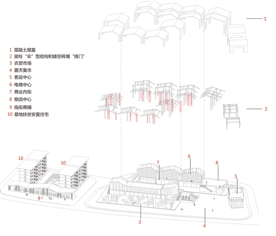湾头桥乡镇中心以赶集场所常见的单元式棚架为空间原型,通过提取、重构与转译,群构成为具有综合属性的永久性公共建筑,以代替临时性、非规范化、引发混乱和隐患的马路市场。乡镇中心从功能上提供了包含商贸中心(集市)、物流中心、电商中心、客运中心等一站式服务功能的平台;从空间上填补乡镇公共空间的普遍缺失;从时间上延续了农村赶集的民俗历史传统;从经济上刺激乡村产业振兴;从文化上是增强乡镇凝聚力的精神中心。