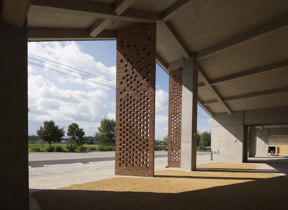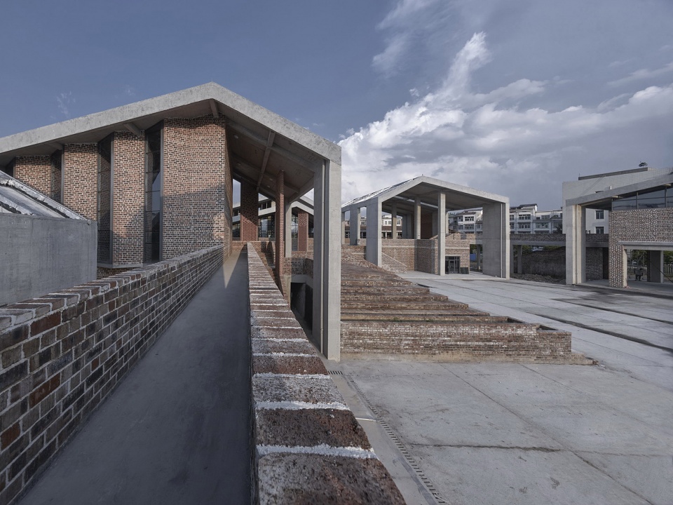 The contrast between the two materials has a dramatic effect. Concrete brings modernity and austere style into the building, while red brick gives people the characteristic warmth and enthusiasm of the countryside. Due to the extreme frugality of the project cost and the uncontrollable construction process, the design details are deliberately considered to be both practical and economic, developed a detailed and interesting design in a controlled way. Hollow row doors of traditional stores are extracted as another prototype, and they update to hollow walls with different heights and angles under the door-shaped units through material replacement and simplification of shape. The hollowing reduces the weight of the brick wall and produces translucency. Whenever in the dusk, low incidence light brings vivid change of light and shadow.
