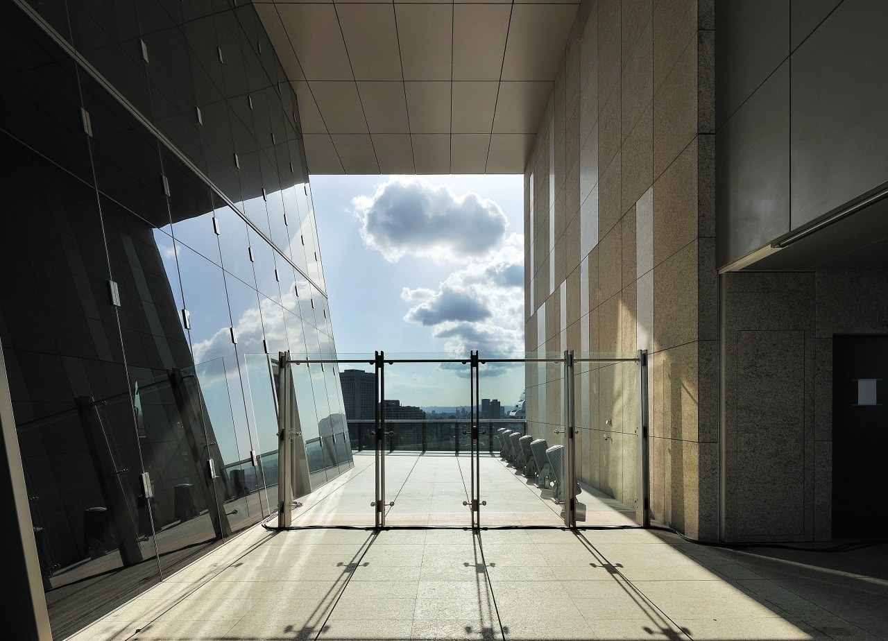整体建筑由门型框架、夹在其间的两座低层量体、以及悬挂在上方的水晶般玻璃量体所构成。两座低层量体之间形成大楼的主入口。如结晶岩石般的玻璃量体以复层深色低辐射玻璃构成,门型框架则以水冲式及平光面处理的石材包覆,开创出新颖韵律对比,赋予高雅美学风格。