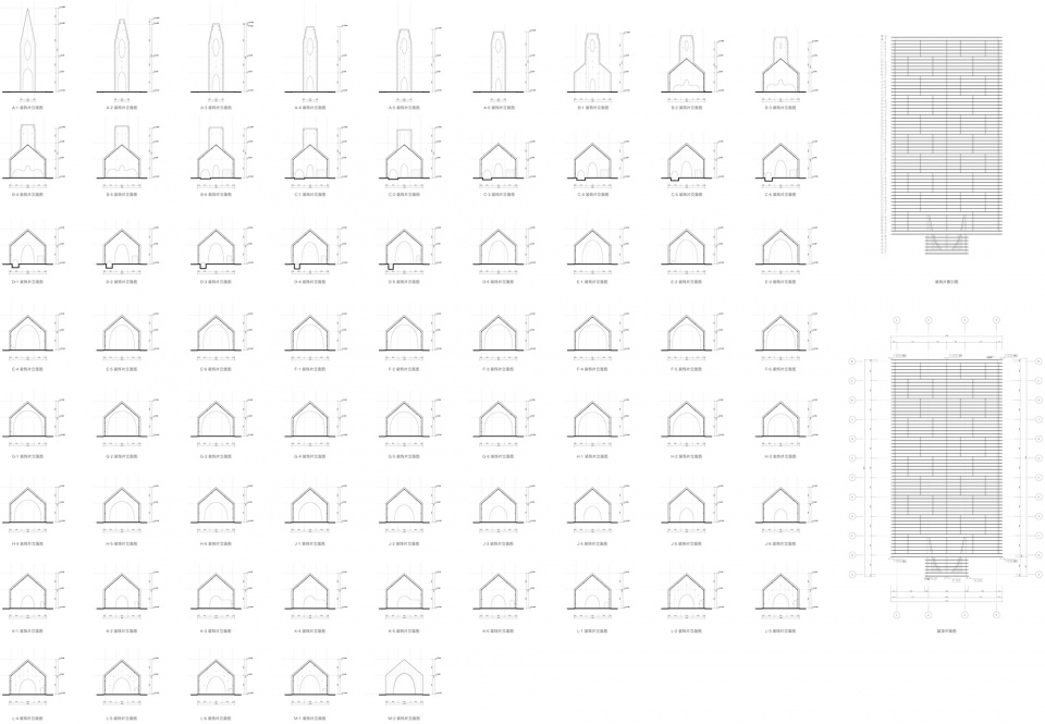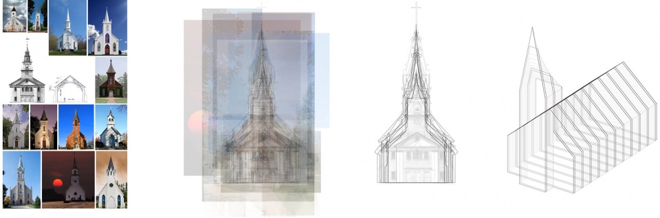 作为建筑的外部形象,我们认为它必须是纯粹的,以使人得以回归小礼拜堂的原型和认知。故而设计过程中,数百个乡野传统教堂的空间及立面形象的抽取,共同勾勒出了一个符合认知意义通感的体量轮廓(切片)系列。