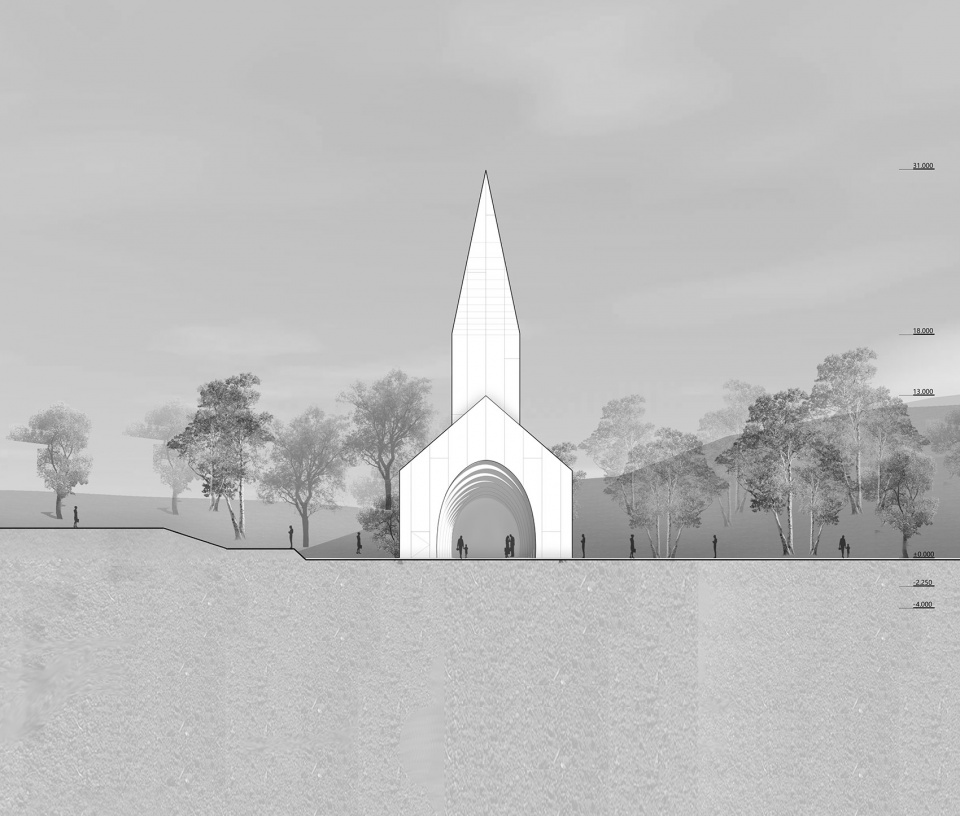 The program favors a more inward-looking approach. Taking advantage of the series of landscapes slopes that block the view behind the calm lake we use that as a passive space to look at from inside the hall. In front of the church entrance, we create a “stage” to emphasize its central position.
