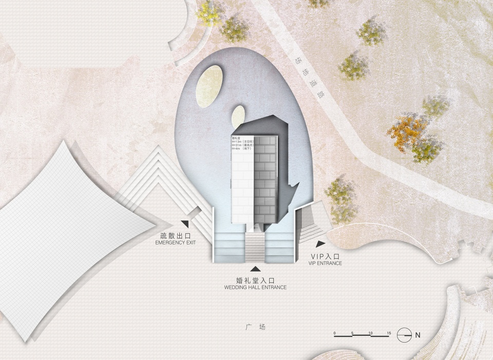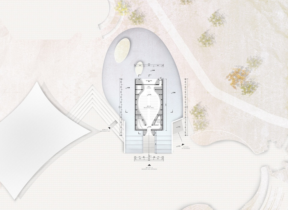 礼堂的主体到访人群从南侧进入前场广场,从西侧拾级而上进入主体建筑中,亦可从背侧的景观之中回望建筑,亦可从广场东北侧的VIP入口进入建筑辅助功能部分。背侧景观试图打破建筑层面的硬质边界感与轴向关系,偏心的湖体轮廓,与置于其中的岛洲,亦和礼堂室内的轴线形成了偏心的对景画面。