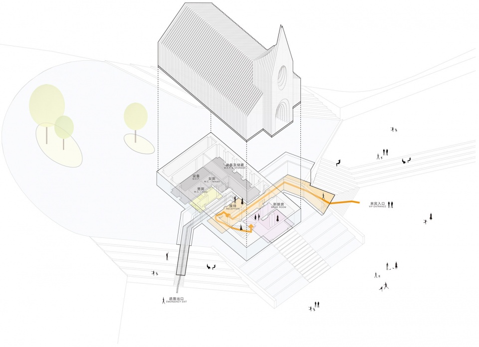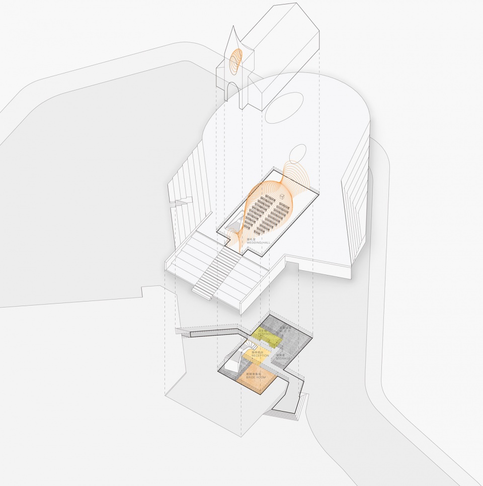 The variation of sections makes the outside of the Chamber Church traditional and hard; while the inside, due to gradual cavity, becomes emotional and soft. It transforms into a space that can carry a series of contents, deriving more ways of usages and richer meanings for the site and its users in the long-term operation and using process.