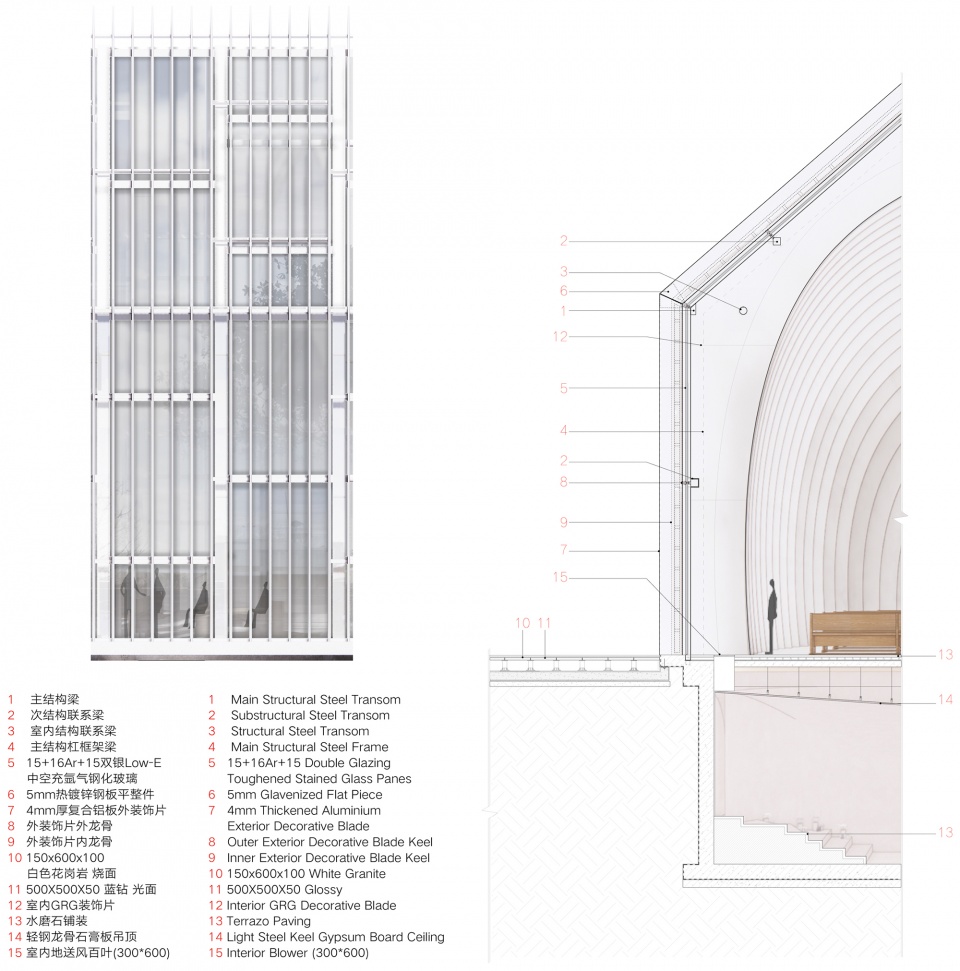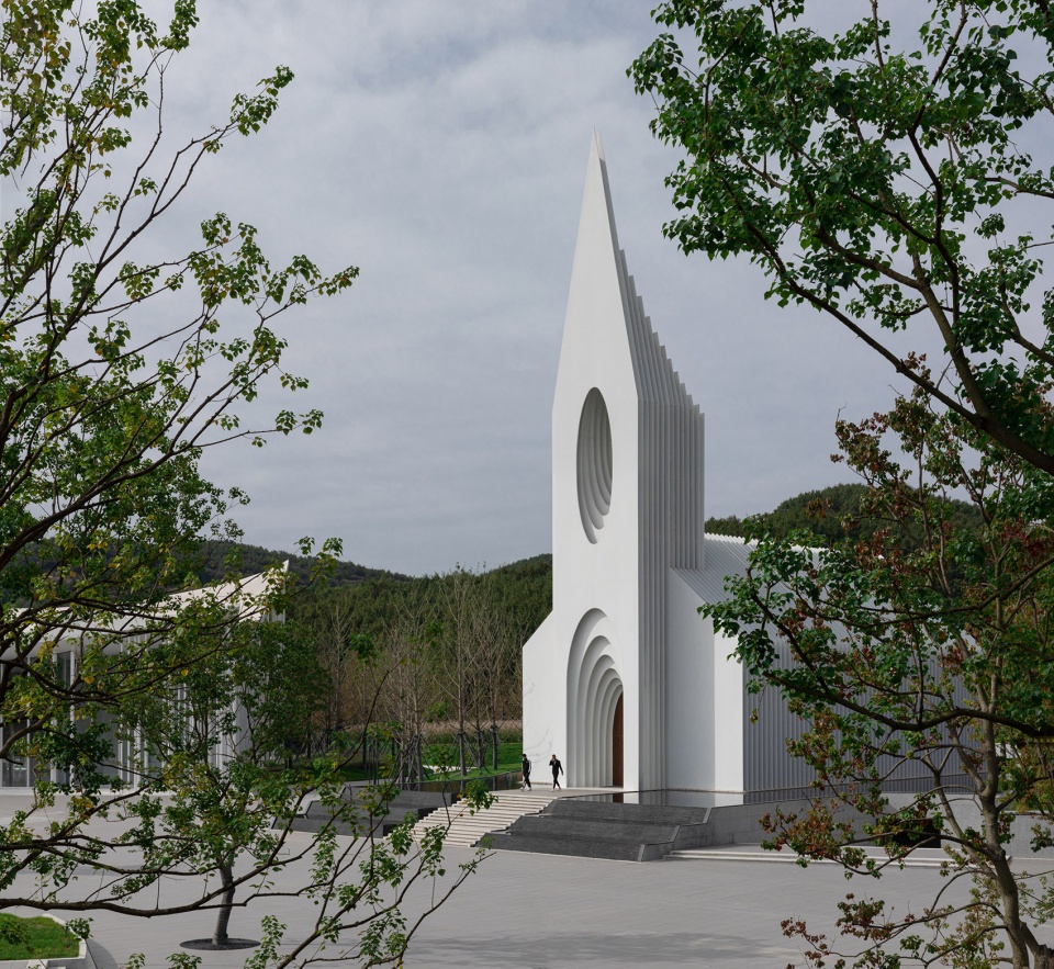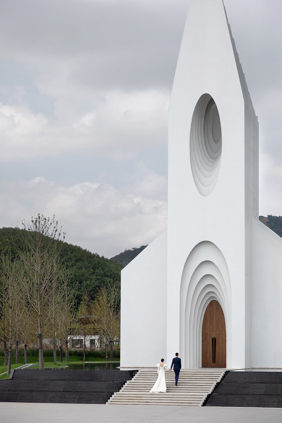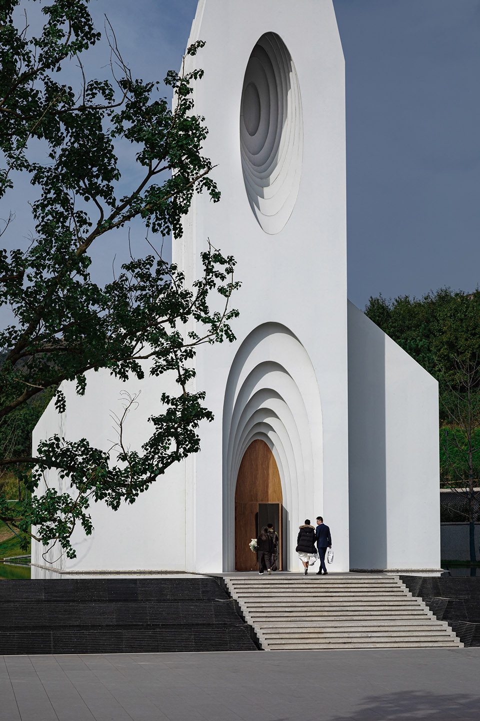 这样的轮廓也从第一重的视觉的体验上符合业主和使用者对这一空间的想象与期待;而连续的每部分切片又以相对纯粹且现代的方式得以呈现,故而使礼堂的外部效果会根据观察者的角度变化而呈现出不同的效果。