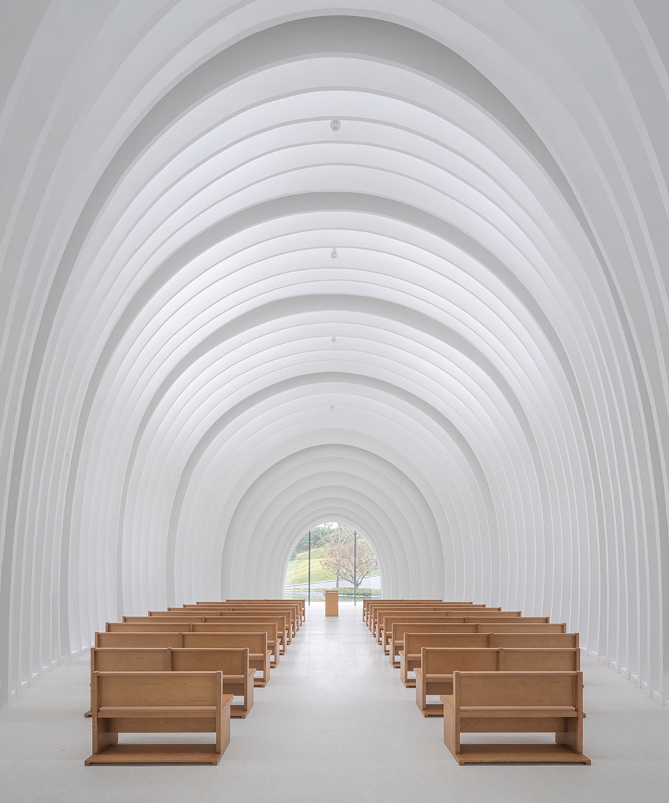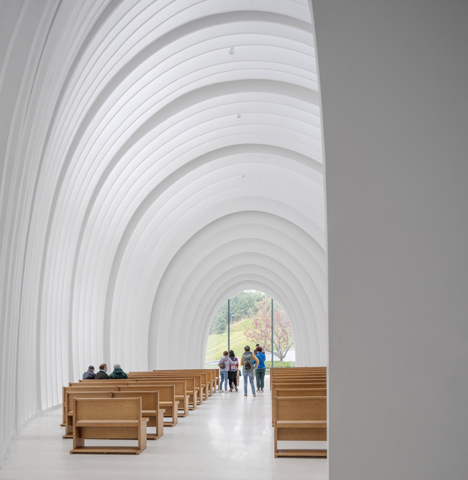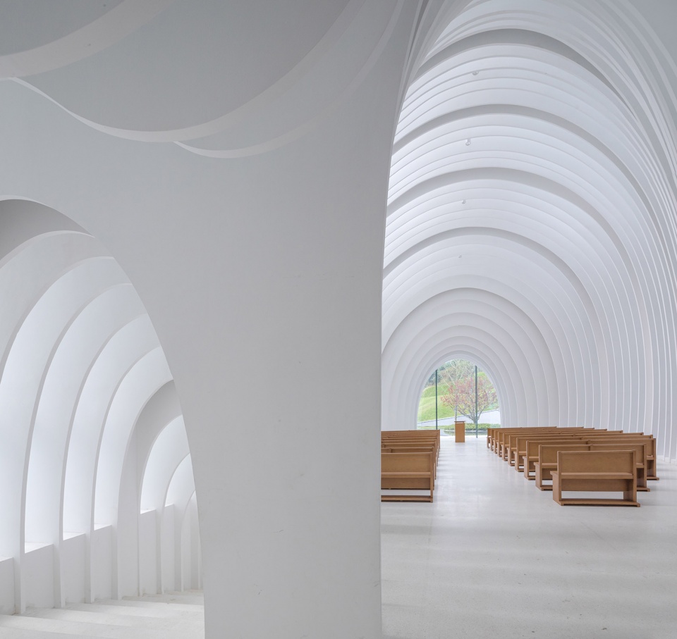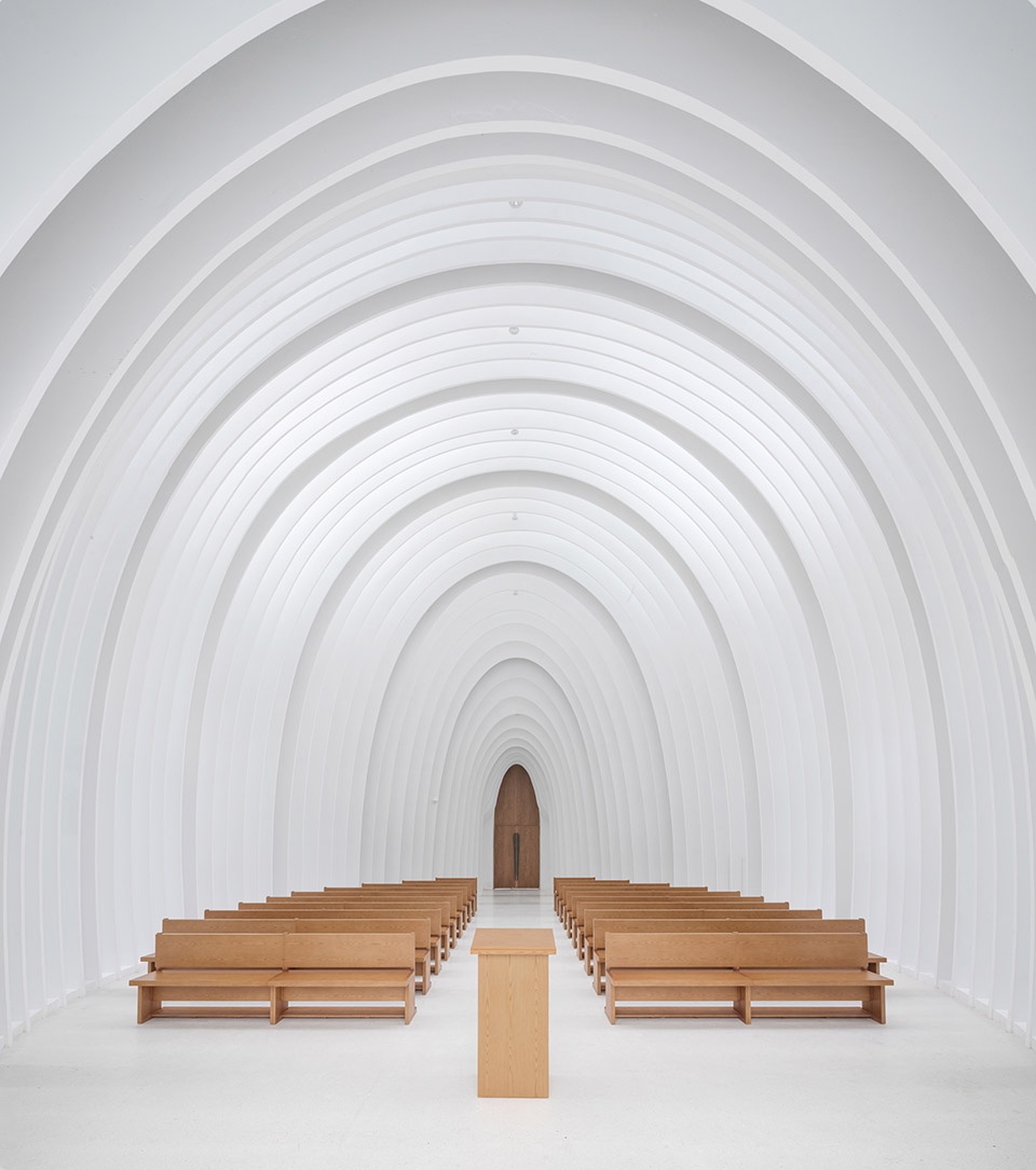 柔和的弧线形的内部空间遵循传统的长方形教堂的平面形式,用一种更加现代的解读方式,创造一系列弧顶架使得内部空间具有更佳流动的体验感。