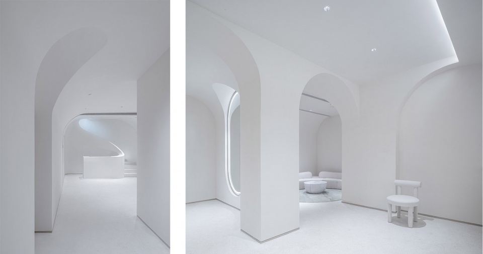 设计提取一系列柔和的曲线随空间序列缩放,形成一个内敛的腔体,其基线关系依然延续传统的巴西利卡的形制,而同时具有极强的流动感。而这些曲面在三维层面则形成一个更具未来感甚至永恒感的状态。同时,这种柔美与其外部坚硬的状态形成强烈对比,以形成内外视觉的互动。