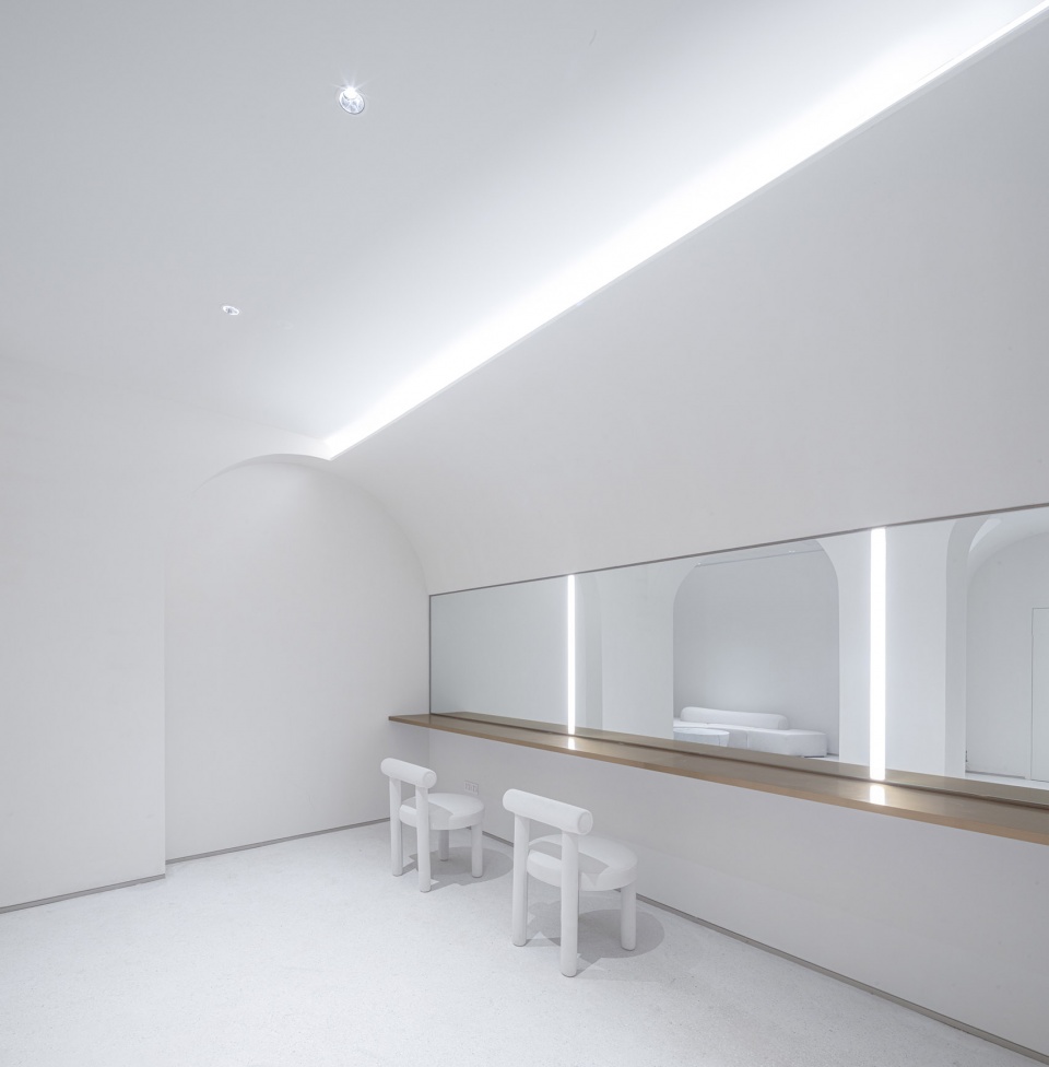 Due to its construction, the longitudinal section is added a grayscale, which increases the possibility of light and shadow intervention, while isolating from the traditional cavernous space with a continuous slice method.