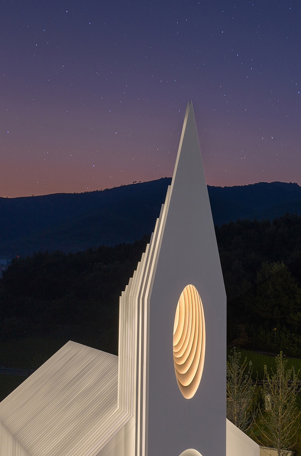 切片的形式所形成的内外轮廓的交叠使建筑在夜间泛出柔和的光线与简洁的外轮廓刚柔相济,同时让即使路过的行人也能感受到圣堂所散发出的神圣光芒。 但其形式是用一种独特的方式形成的: 一系列的铝板(外)/ GRG(内)切片纵向排列, 每个切片为5公分厚,每个切片间的缝隙为40公分。所有这些切片组成的形成整个墙壁,屋顶以及塔楼。这些切片形成体量的内部是另外一种形式的切割形成一种更加自由形态的空间。