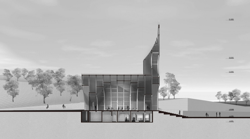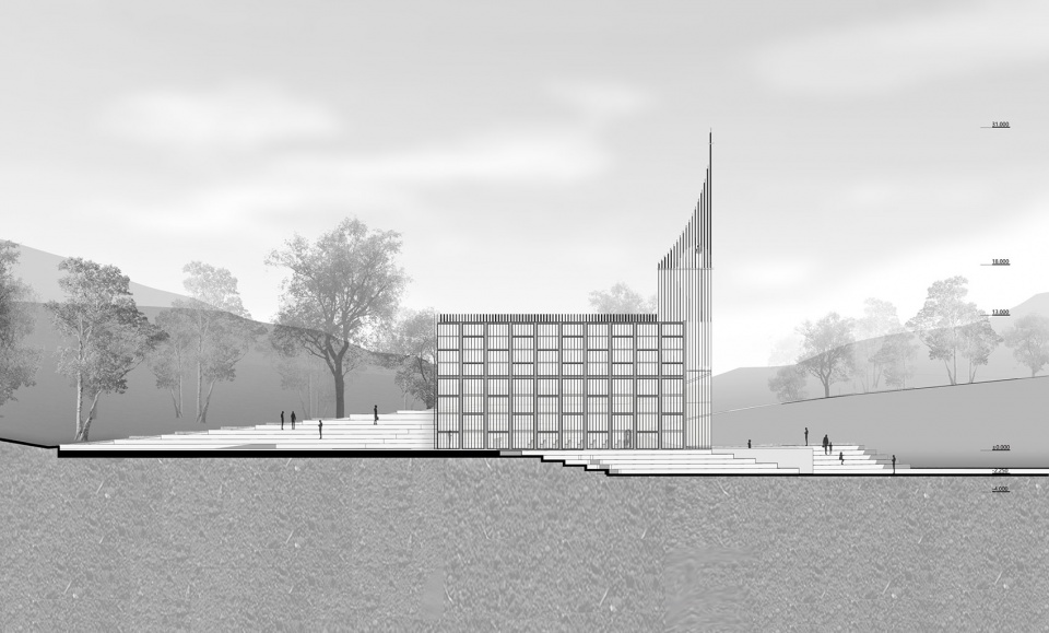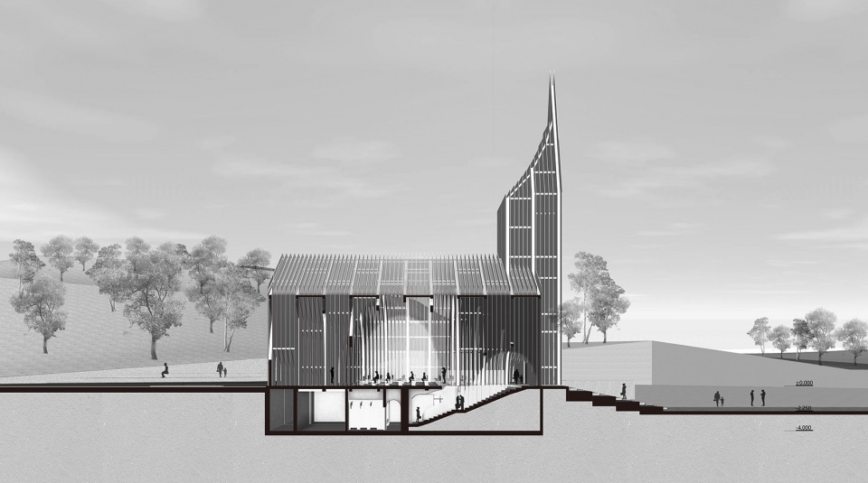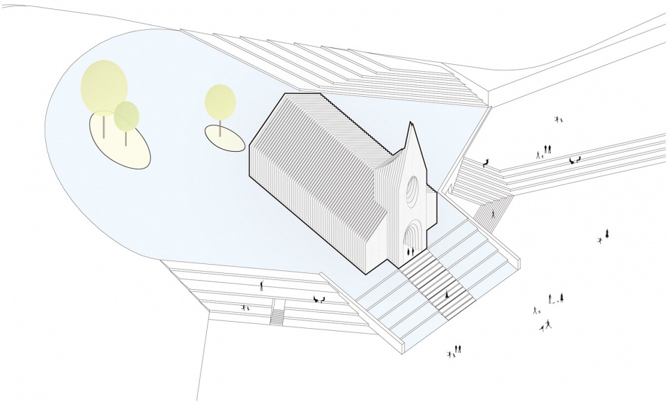 The Chamber Church aims to create a spatial container that both respects the past and looks towards the future. It shall provide a religious experience and secular touch. The lower part of the auditorium is divided into two parts: the semi-sunken space and the connected patio form a link to the surrounding landscape. It is embedded in the mountain and connected to the square. It is the hidden foundation on which the upper part of the auditorium can stand proud between the mountain and the water, reflecting the power of heaven and earth and spreading the gospel of creation.