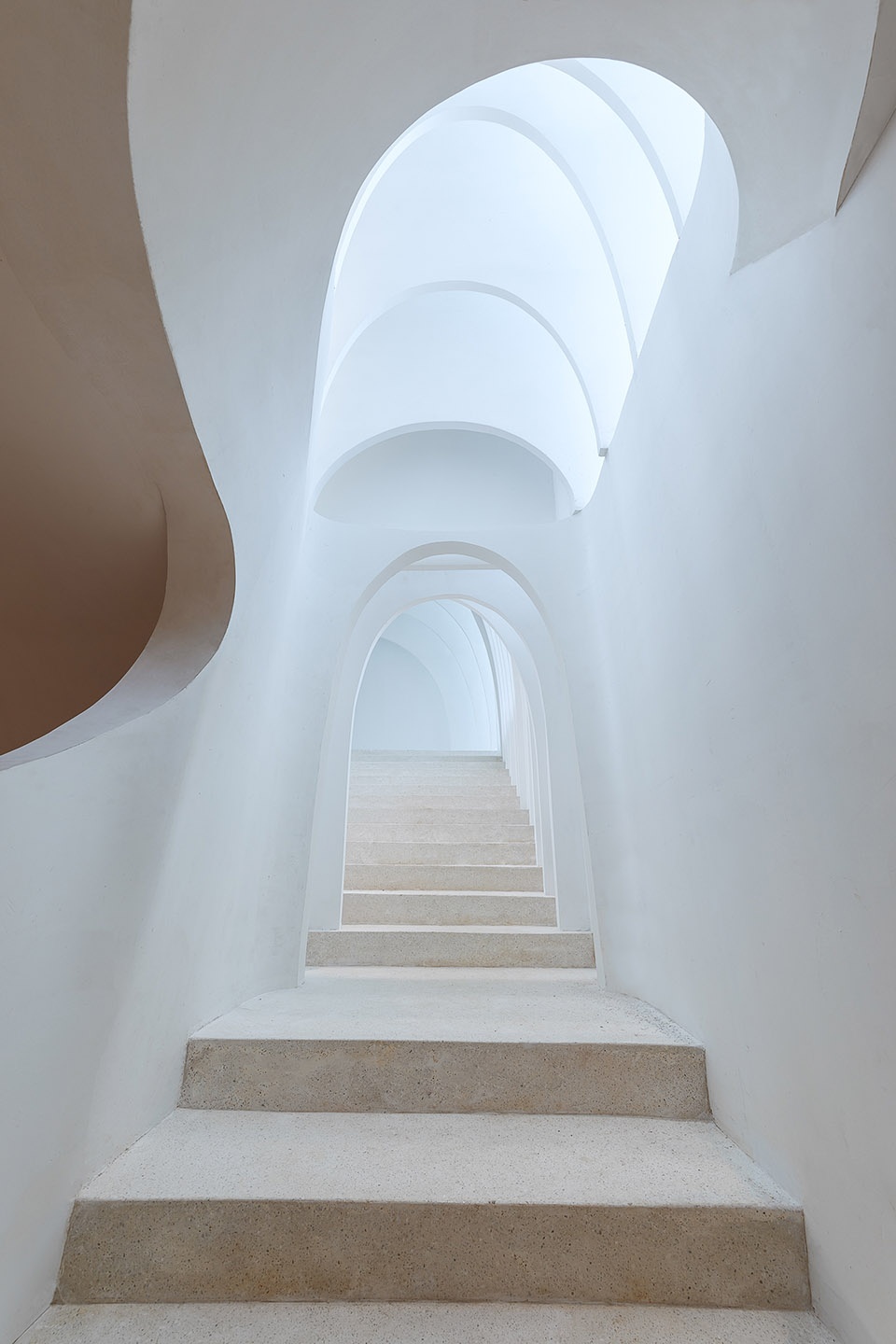 The cascading white slices soften the interior light while wrapping the main frame and construction system of the building, giving the entire assembly a concise and austere atmosphere, which is both a contemporary aesthetic tendency and an echo of tradition – a fusion of heritage and contemporaneity.