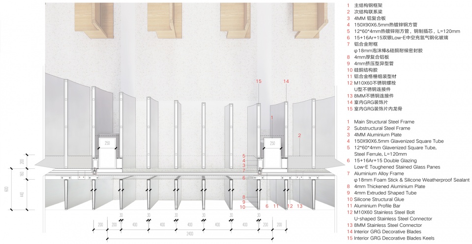 3. The connection between the series of portal steel frames is achieved by two levels of structural bars: the main beam runs through and ties all the steel frames together, while clearly outlining the longitudinal outer contours of the church. The secondary beams differ from the main beams in that they have been deliberately misaligned in the design. On the one hand, the spacing between the bars is reduced without increasing them, making the whole building form a box-like structure. The expression of the structure is alienated and dissolved in the longitudinal direction, while the spatial progression formed by the horizontal portal frame in the longitudinal direction is enhanced. On the other hand, the secondary beams become the backbone of the façade structure at the same time, achieving the integration of skin and structure.