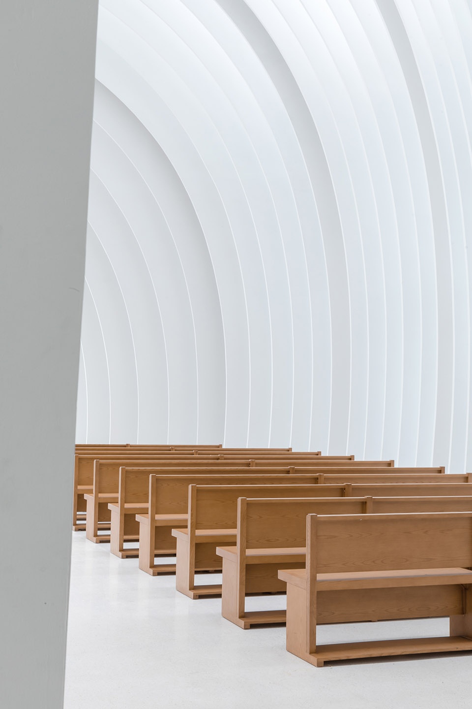 The softly curved interior follows a traditional basilica layout with a more contemporary interpretation.